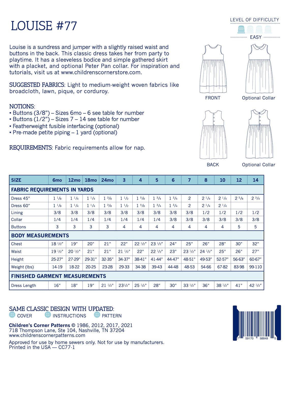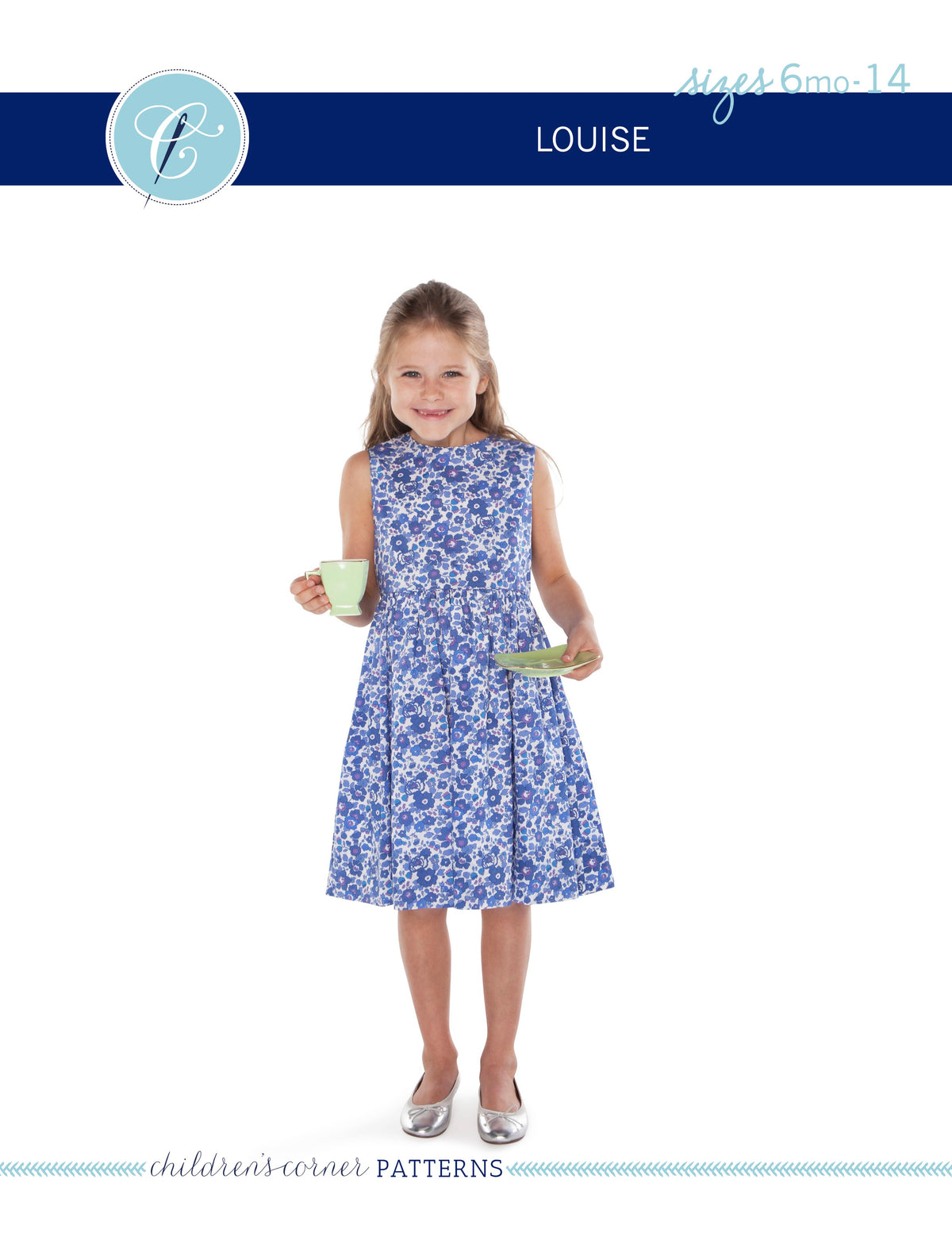 Louise is a sundress and jumper with a slightly raised waist and buttons in the back. This classic dress takes her from party to playtime. It has a sleeveless bodice and simple gathered skirt with a placket, and optional Peter Pan collar.