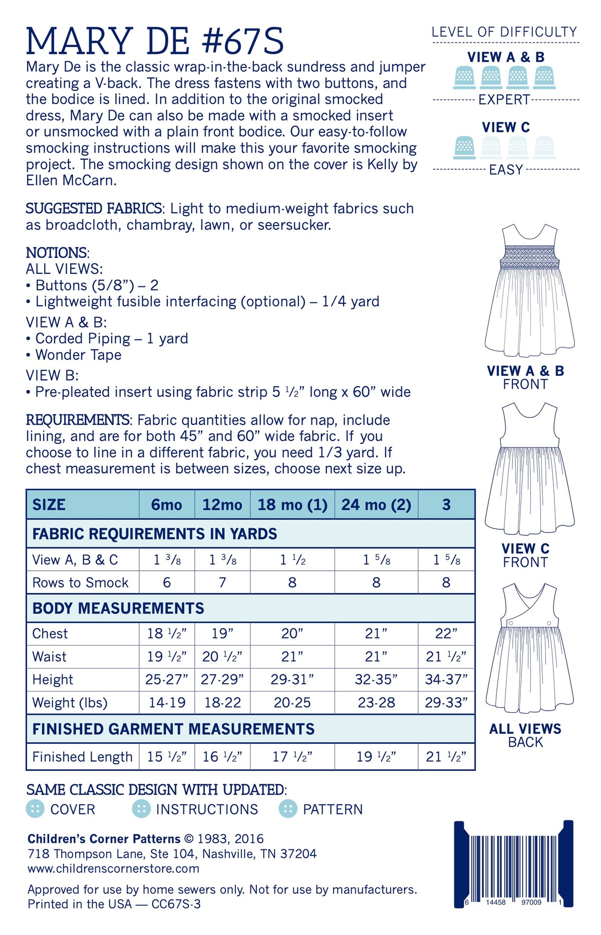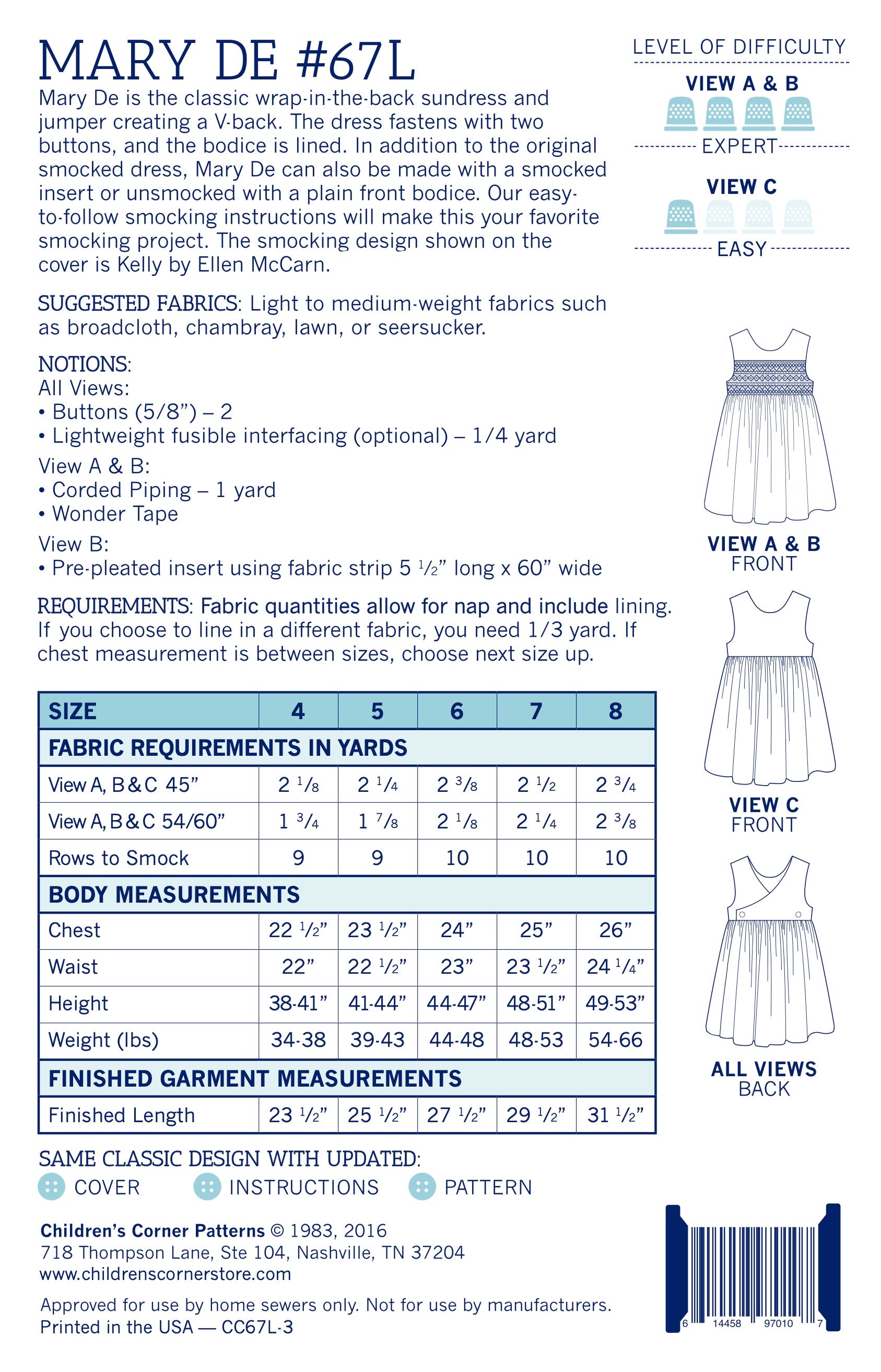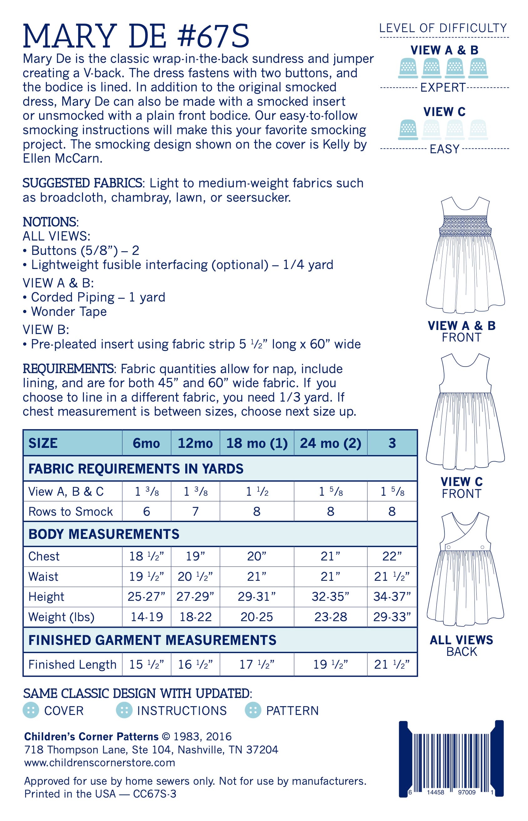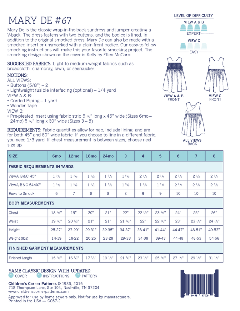 Mary De is the classic wrap-in-the-back sundress and jumper creating a V-back. The dress fastens with two buttons, and the bodice is lined. In addition to the original smocked dress, Mary De can also be made with a smocked insert or unsmocked with a plain front bodice. Our easy-to-follow smocking instructions will make this your favorite smocking project. The smocking design shown on the cover is Kelly by Ellen McCarn