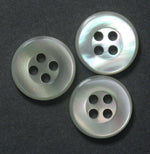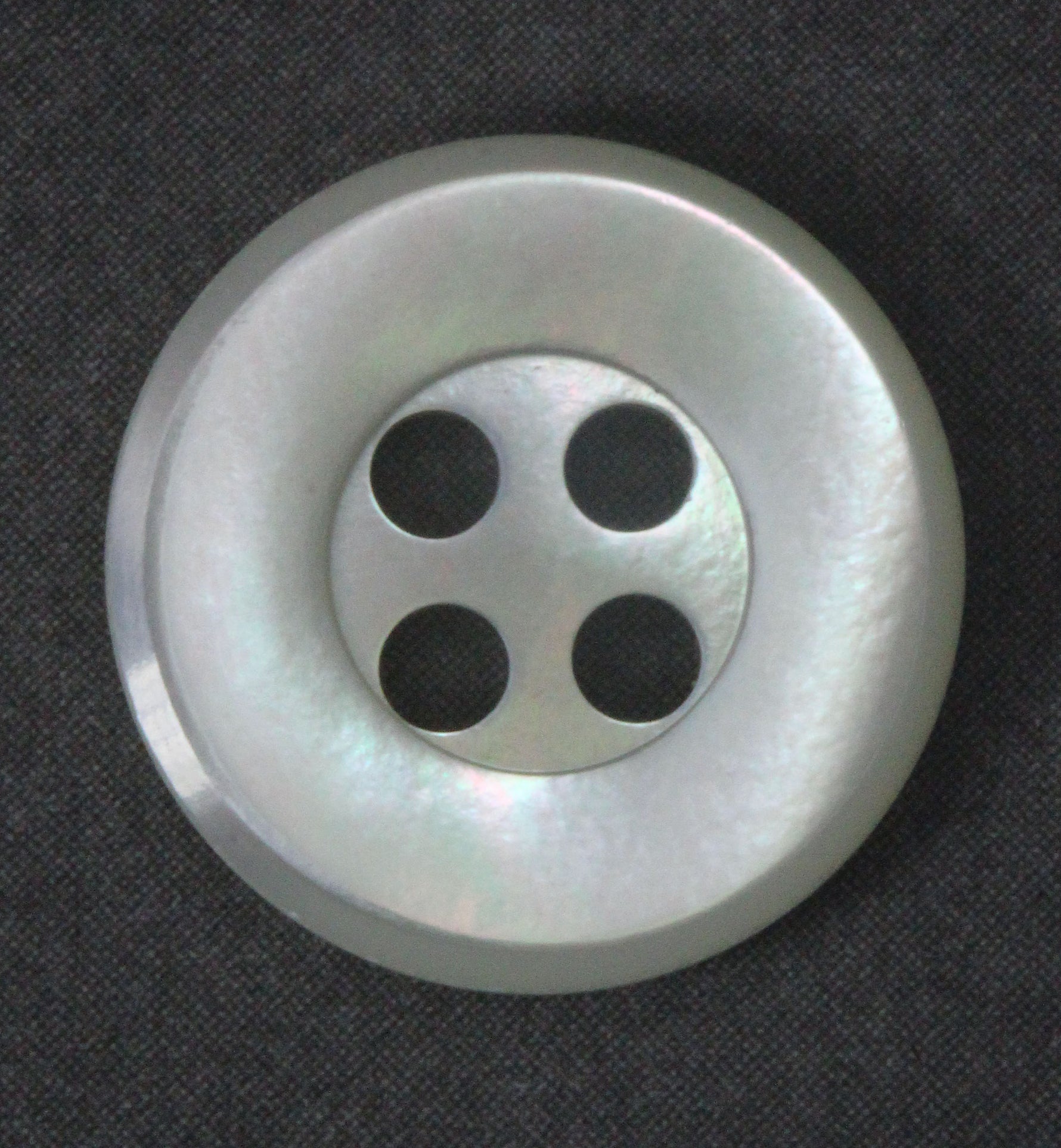 Four holed shell button with wide rim. Size 16 - 1/2"