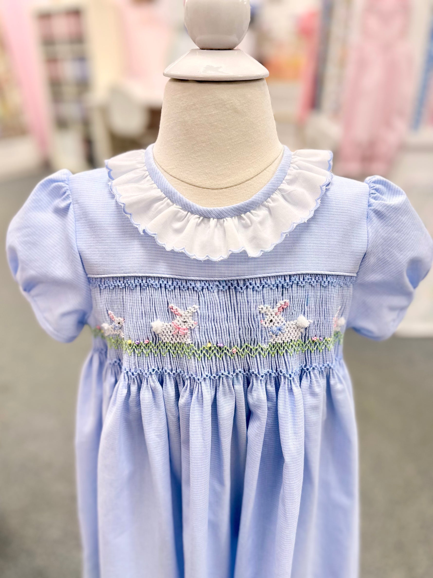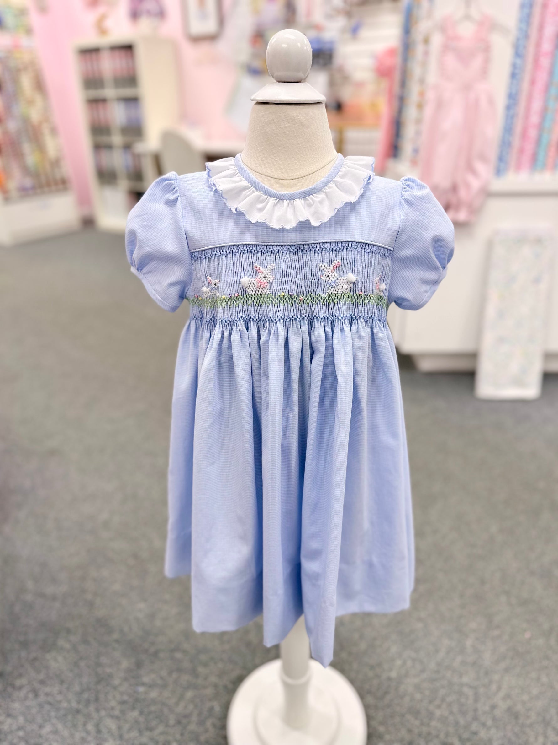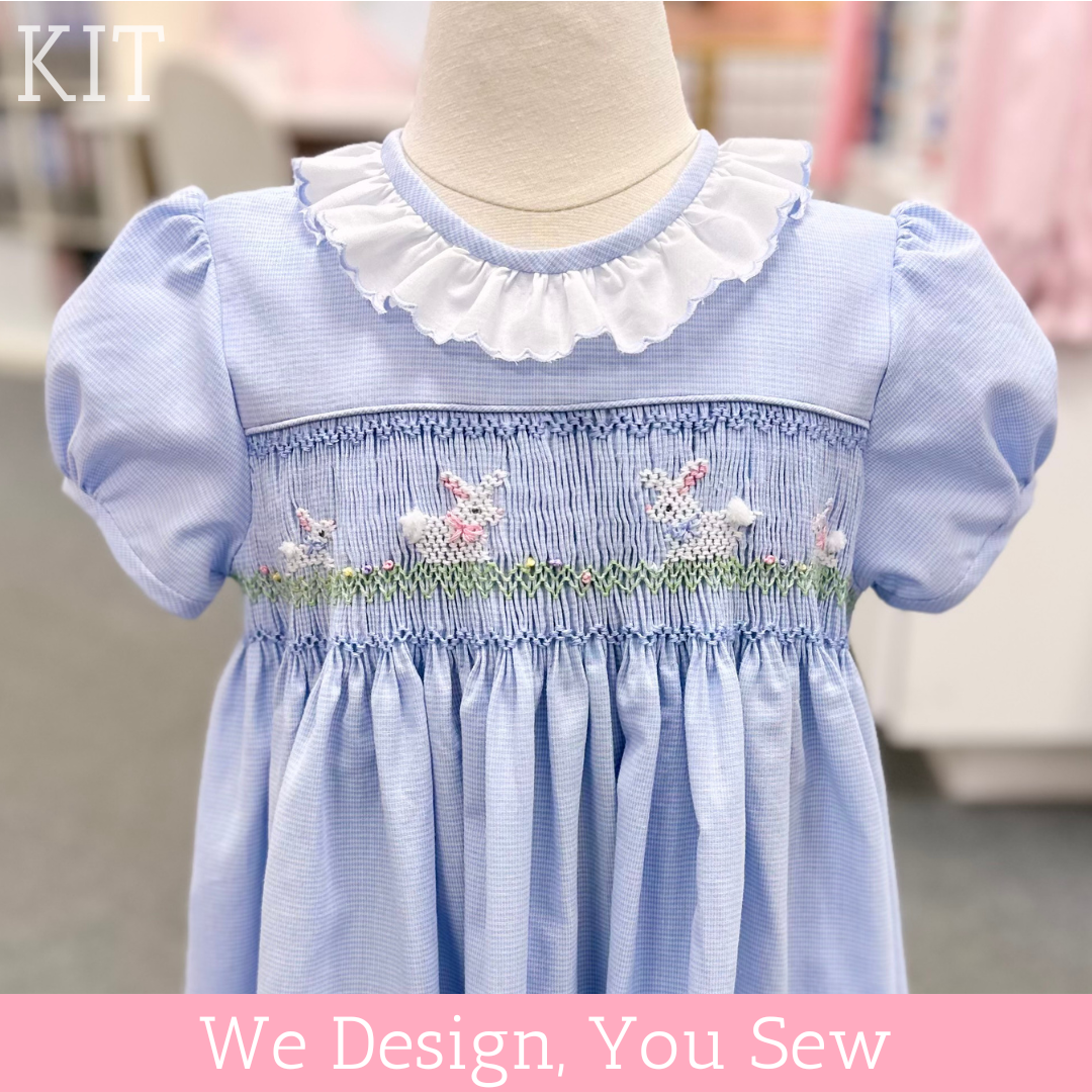 Nothing says Easter like a classic smocked Lee dress. We will pleat across the full width of one side of the fabric that you will use for the smocked skirt. You will then smock and finish construction on this adorable outfit. Kits include fabric and necessary notions and are available in 3 size groups.