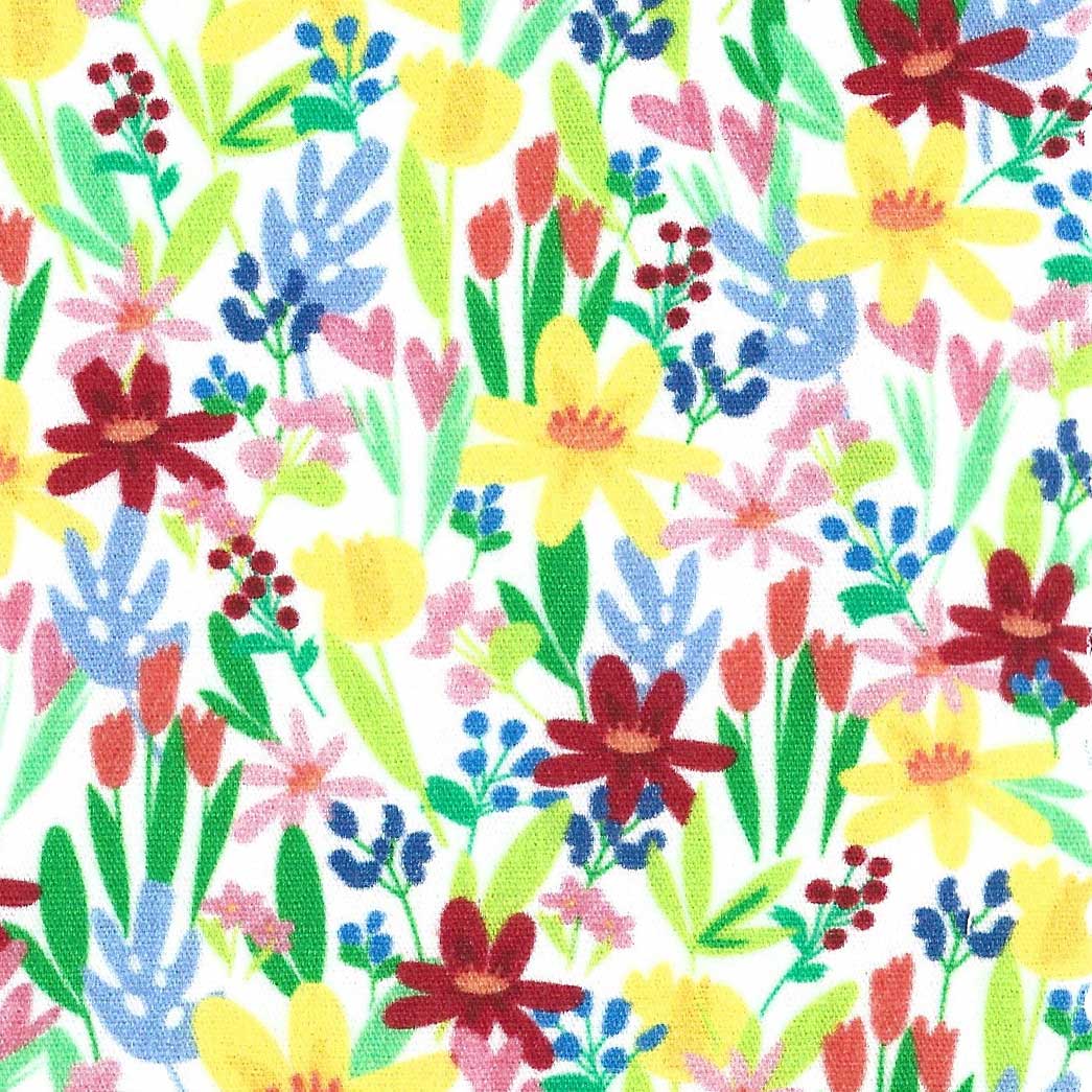 Yellow, Red, Blue, Green, and Pink Floral Fabric – Print #2796. 100% cotton print. 60″ wide. This fabric has a yellow, red, blue, and green floral print on a solid white background. It’s ideal for dresses, tops, or kids’ outfits.