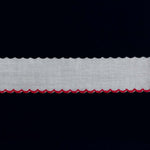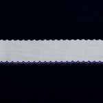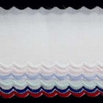 White Swiss embroidered edging with various colors scalloped edge. Available in aqua, blue, pink and white.