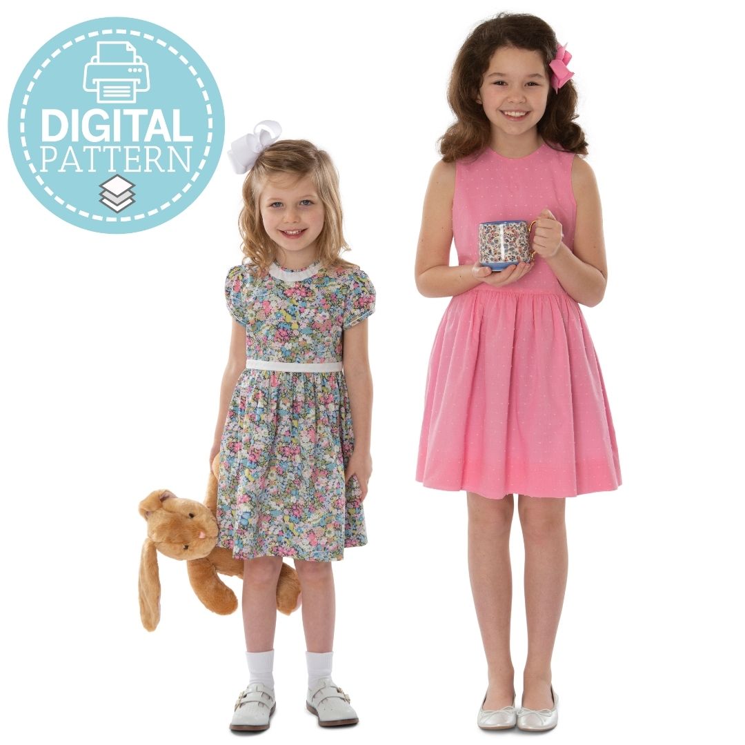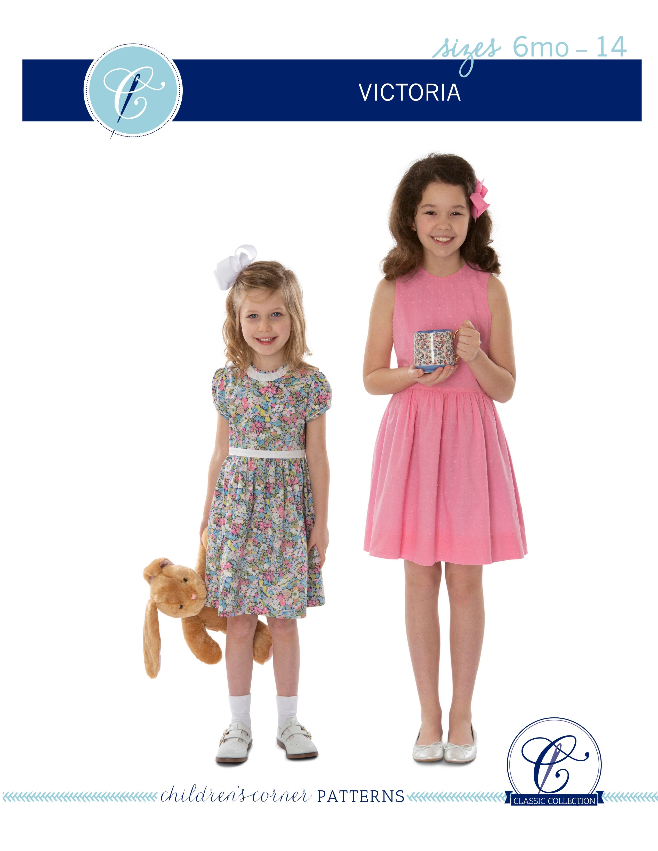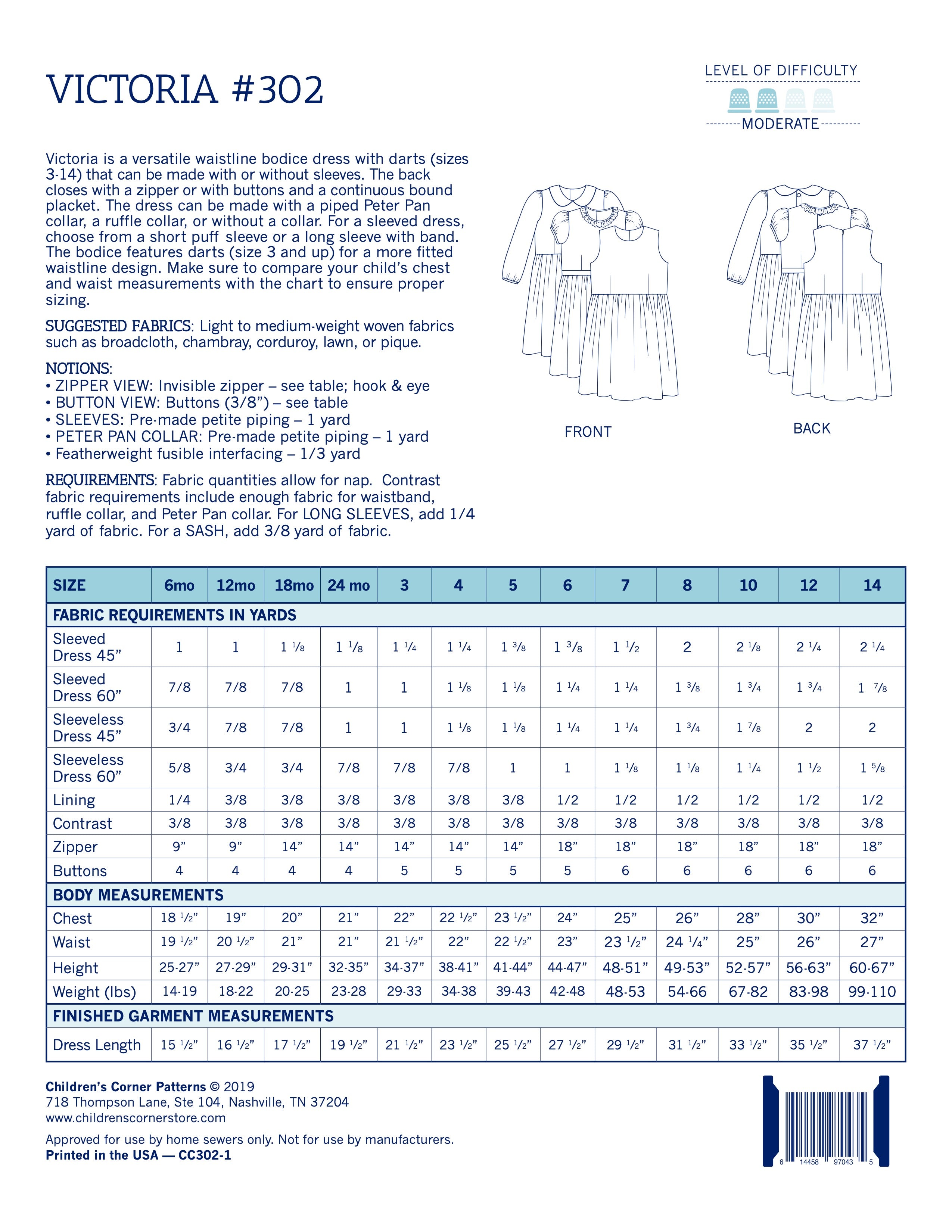 Victoria is a versatile waistline bodice dress that can be made with or without sleeves. The back closes with a zipper or with buttons and a continuous bound placket. The dress can be made with a piped Peter Pan collar, a ruffle collar, or without a collar. For a sleeved dress, choose from a short puff sleeve or a long sleeve with band. The bodice features darts (size 3 and up) for a more fitted waistline design. The waist is accented by a waistband or a sash. Make sure to compare your child’s measurements with the chart to ensure proper sizing.