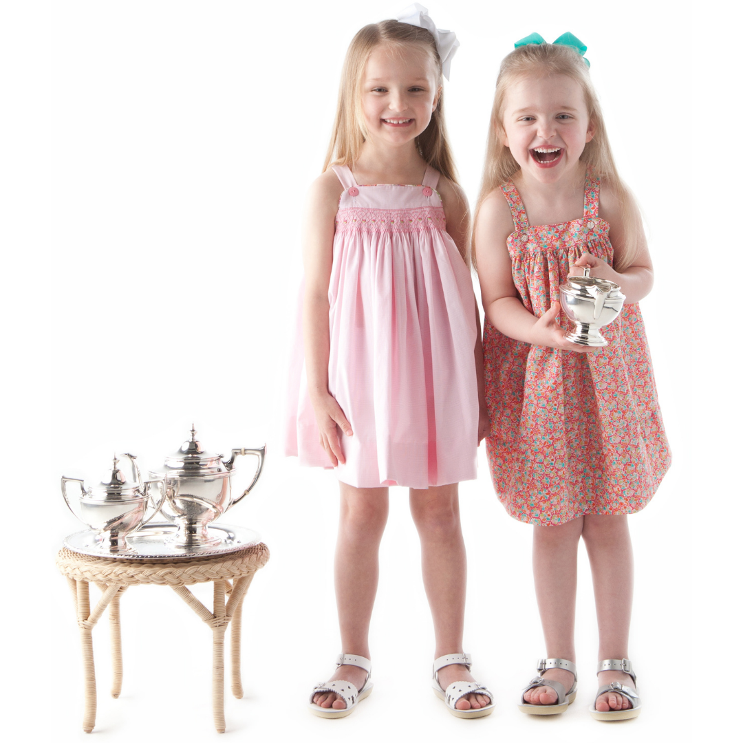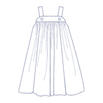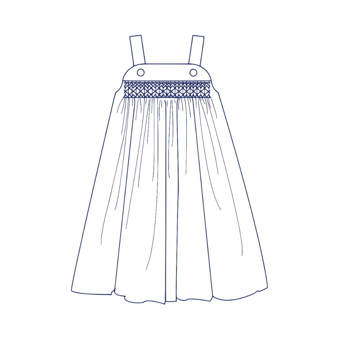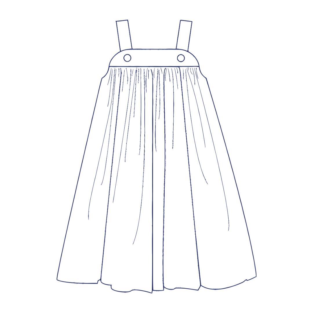 Katina is a classic sundress/jumper with straps that button onto the front yoke. The yokes are lined. Both skirts can be gathered or smocked for a breezy and easy-to-wear dress. Underarms are finished with a bias band. The pattern pieces are printed unstacked on paper and dimensions are provided for the skirts. You will love our easy-to-follow geometric smocking design and smocking guide.