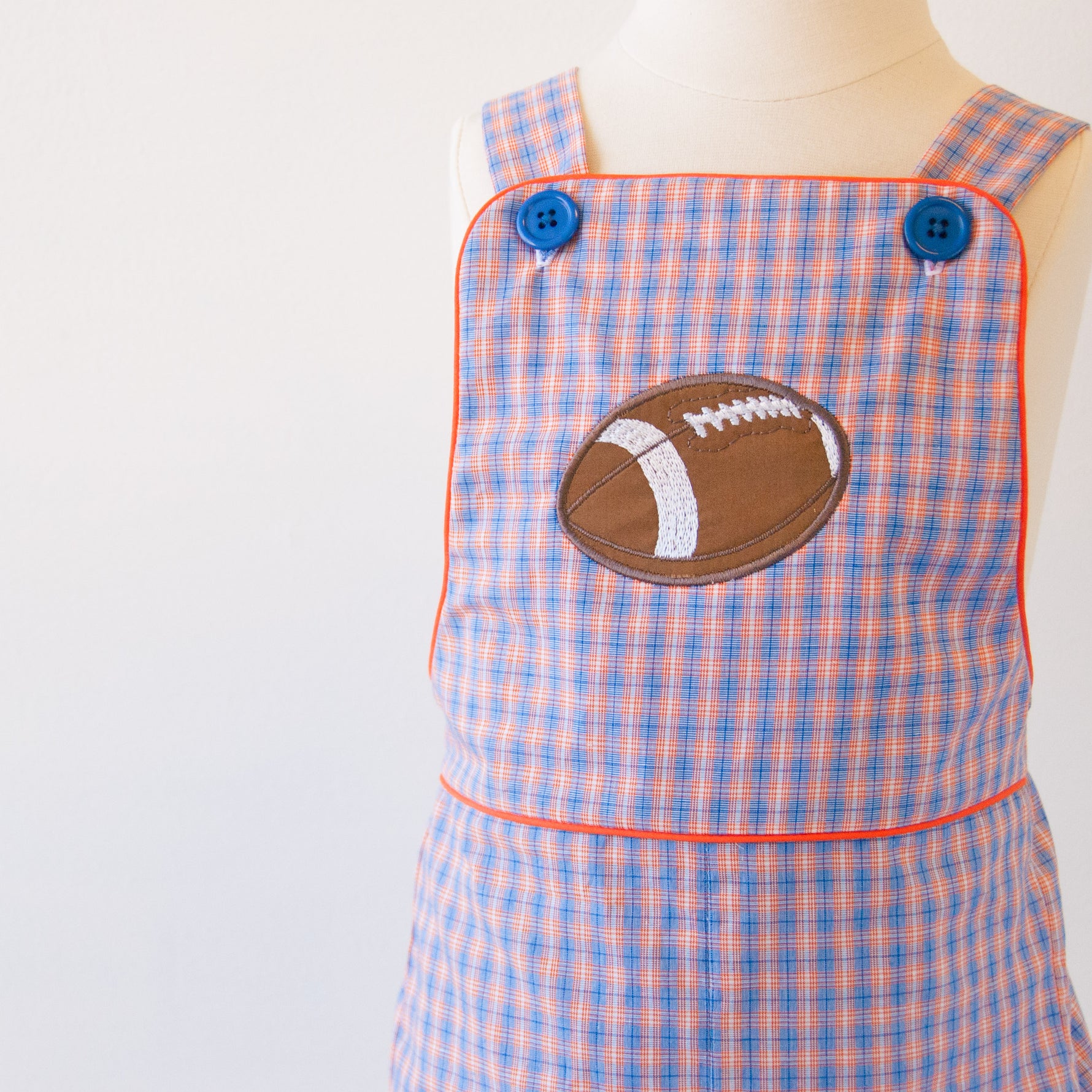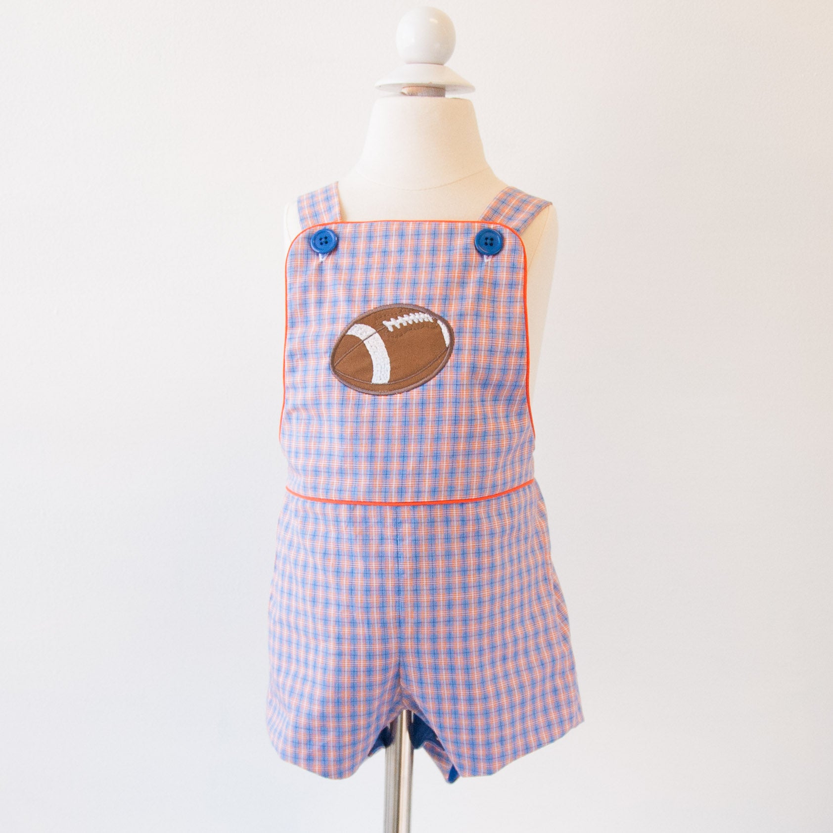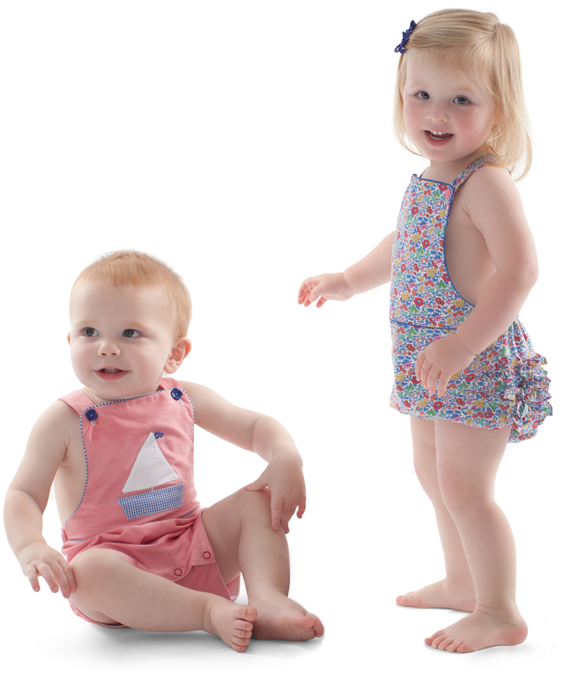 Bailey is a timeless romper for boys and girls. Whether you are off to the beach or a picnic, this romper will keep your little one comfortable and always in style. View A, for girls, has adorable ruffles on the seat and added fullness with elastic at the legs. View B, for boys, has straight legs. The shoulder straps cross in the back and the elastic waist provides a great fit. The piped bib is perfect for a monogram or an appliqué. Bailey has easy to follow instructions and illustrations suitable for beginners, as well as, the advanced seamstress.