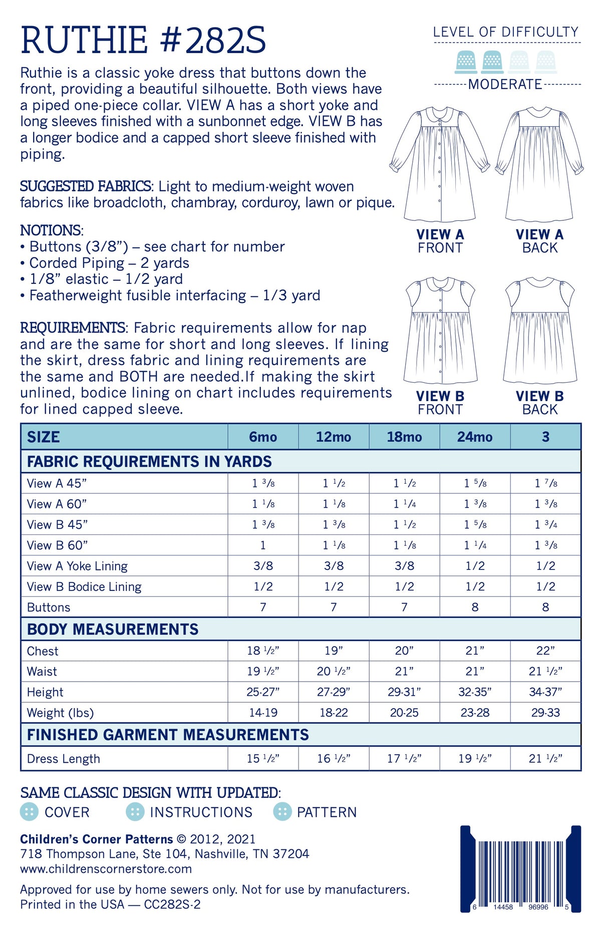 Ruthie is a classic yoke dress that buttons down the front, providing a beautiful silhouette. Both views have a piped one-piece collar. VIEW A has a short yoke and long sleeves finished with a sunbonnet edge. VIEW B has a longer bodice and a capped short sleeve finished with piping.