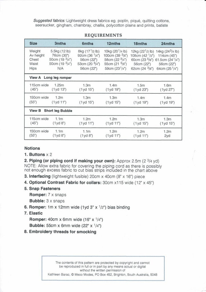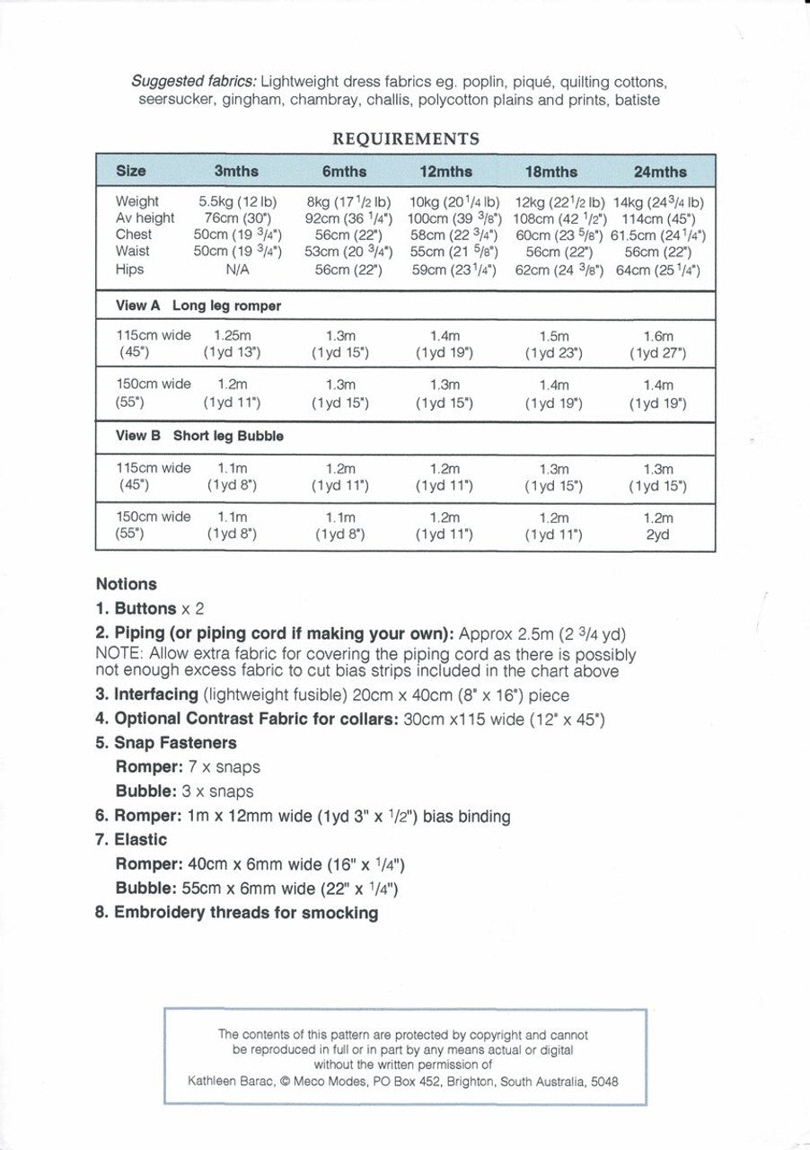 Bubble and Romper pattern by Lyn Weeks & Kathy Barac of Meco Modes, Smocked front, gathered back, Two collar variations, Piped neckline, Elastic leg casing on both romper and bubble.