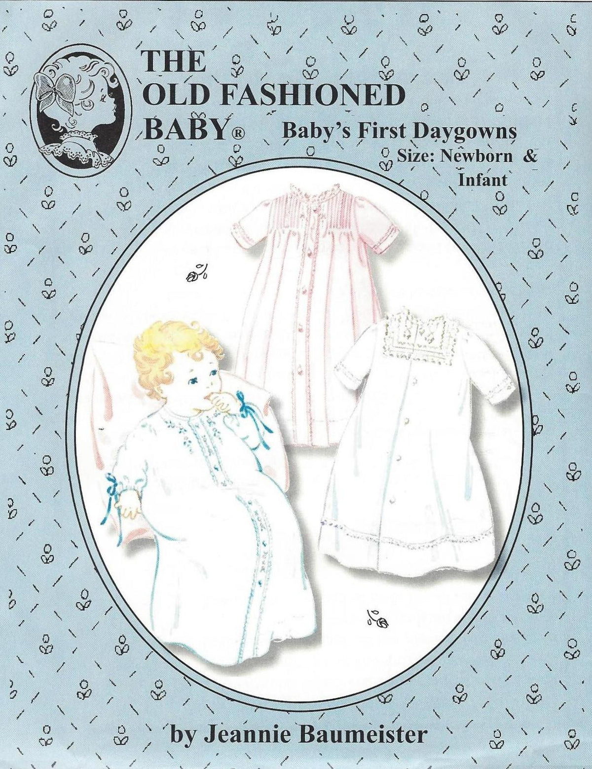 This button-in-the-front daygown is so sweet and easy to make that it will become your standard pattern for baby gifts. Includes a "Take Me Home" infant size 7-13lbs. View 1 features a plain front and sweet embroidery. View 2 features a lace yoke. View 3 is accented with tucks on the yoke.  There is a choice of three different sleeves which can be used in any view.  Two sleeve versions are cuffed, one offers long sleeves and the other is 3/4 length The Gertrude Slip pattern is included.