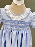 A classic smocked Children's Corner Lee, with our favorite embroidered scallop trim. This trim accents this beautiful solid fabric. This kit includes the pre-pleated fabric and notions needed for this adorable dress!