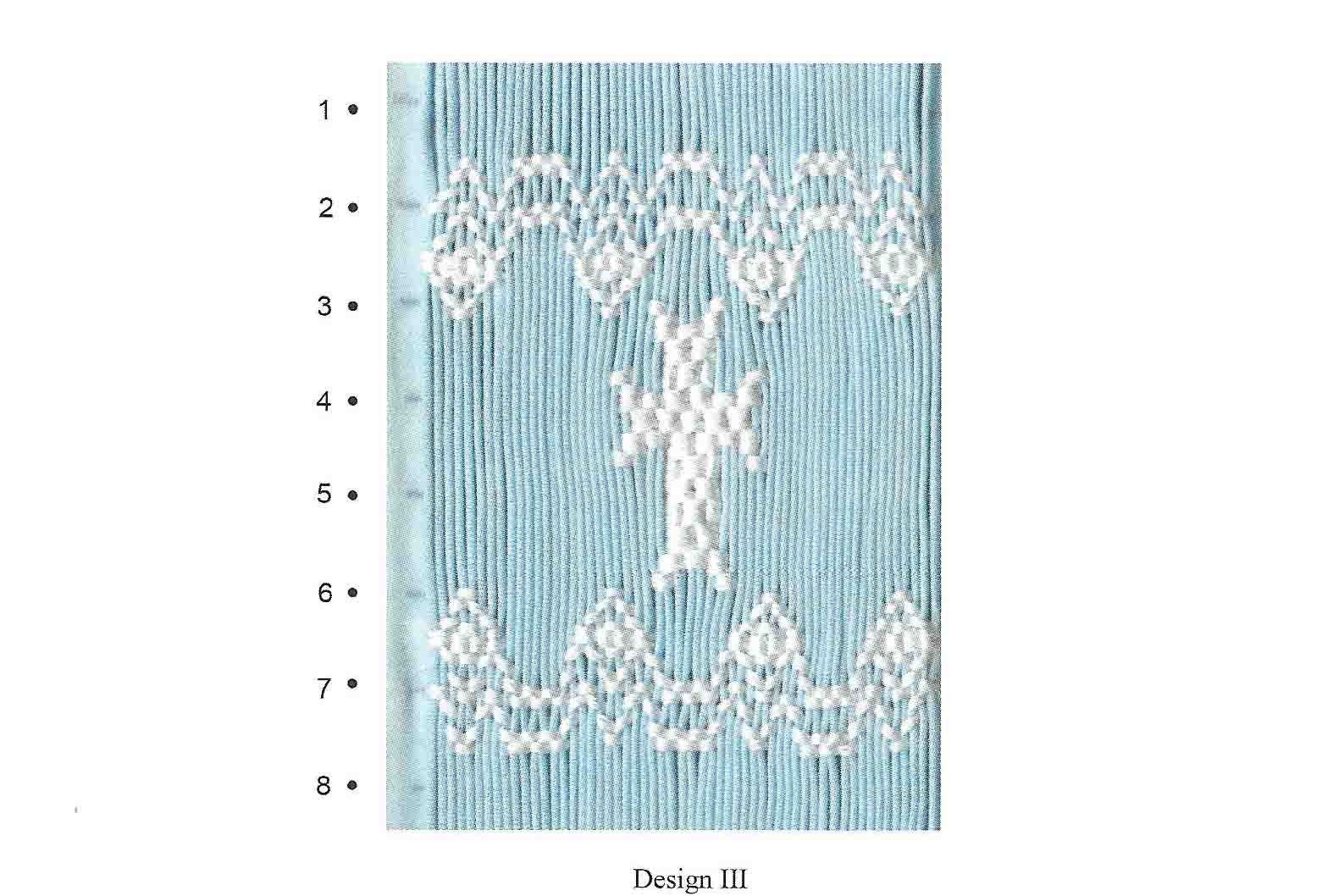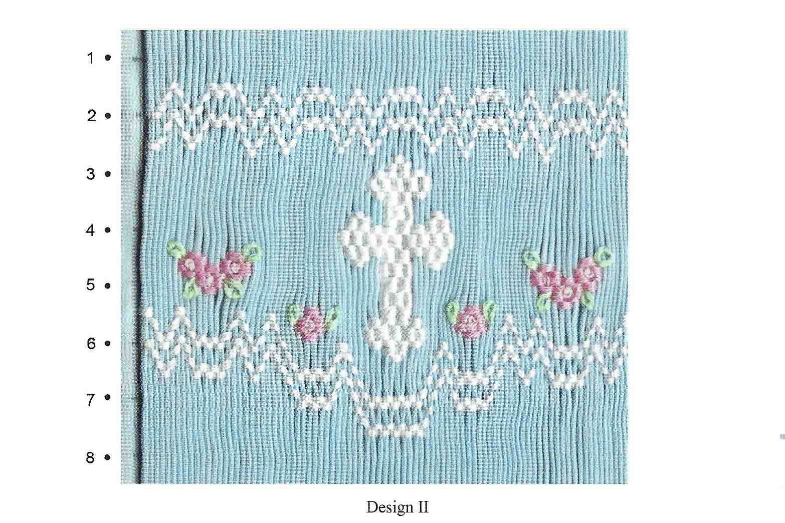 Smocking plate with three variations of a cross on a yoke, a bishop and without flowers. 8 rows of smocking on a yoke or a bishop.