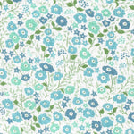 Blue and Green Floral Fabric – Print #2766. 100% cotton print. 60″ wide. This fabric has a blue and green floral print on a solid white background.