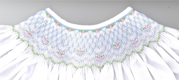 Smocking plate with sweet geometric design. 7.5 rows of smocking on a bishop.