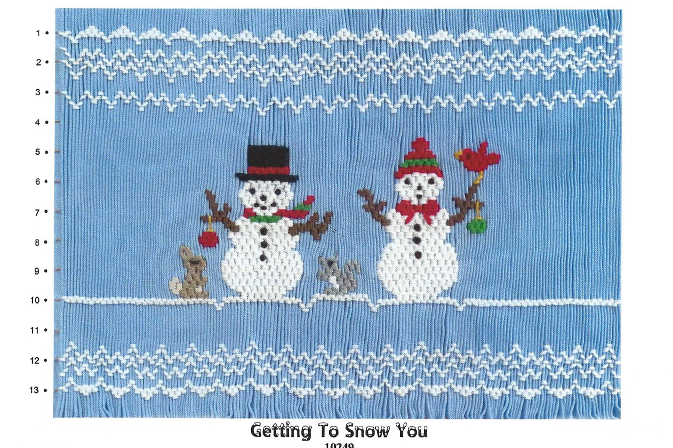 Smocking plate with snowmen designs. Includes yoke variation. 13 rows of smocking on a yoke.