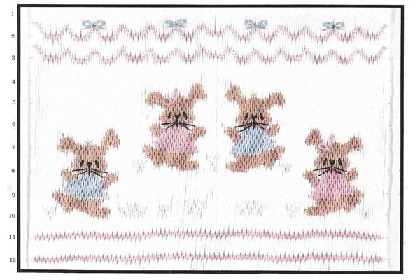 Smocking plate with four bunnies in mid hop. 12 rows of smocking on a yoke.