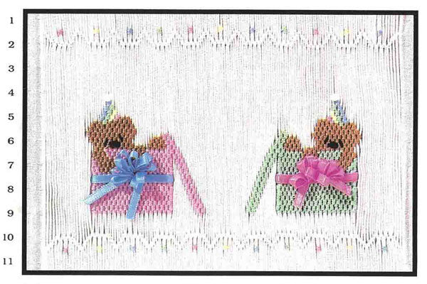 Smocking plate with two bears inside present boxes. 11 rows of smocking on a yoke.