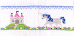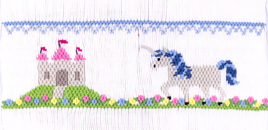 Smocking plate with a unicorn approaching a castle on a hill. 7.5 rows of smocking on a yoke.