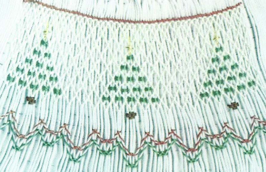 Smocking plate with trees topped with a star on a geometric design. 8 rows of smocking on a bishop.