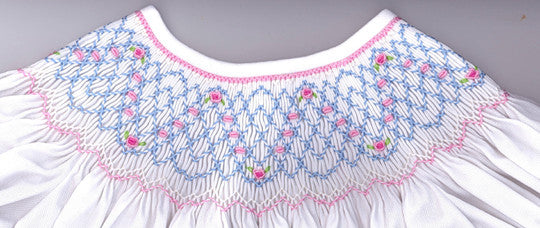 Smocking plate with geometric pattern with bullion roses. 8 rows of smocking on a bishop.