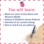 A 4-part series that describes all the techniques you need to know when sewing Children's Corner patterns. In addition to many conversations about some of the why’s behind what we do, we break down specific techniques and show you how to create a sample. We encourage you to print the PDF that accompanies the videos and fill your pages with these samples to create a resource binder.