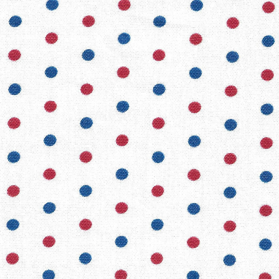 Red and Blue Polka Dot Fabric – Print #2728. 100% cotton fabric. 60″ wide. This fabric has red and blue on a solid white background.