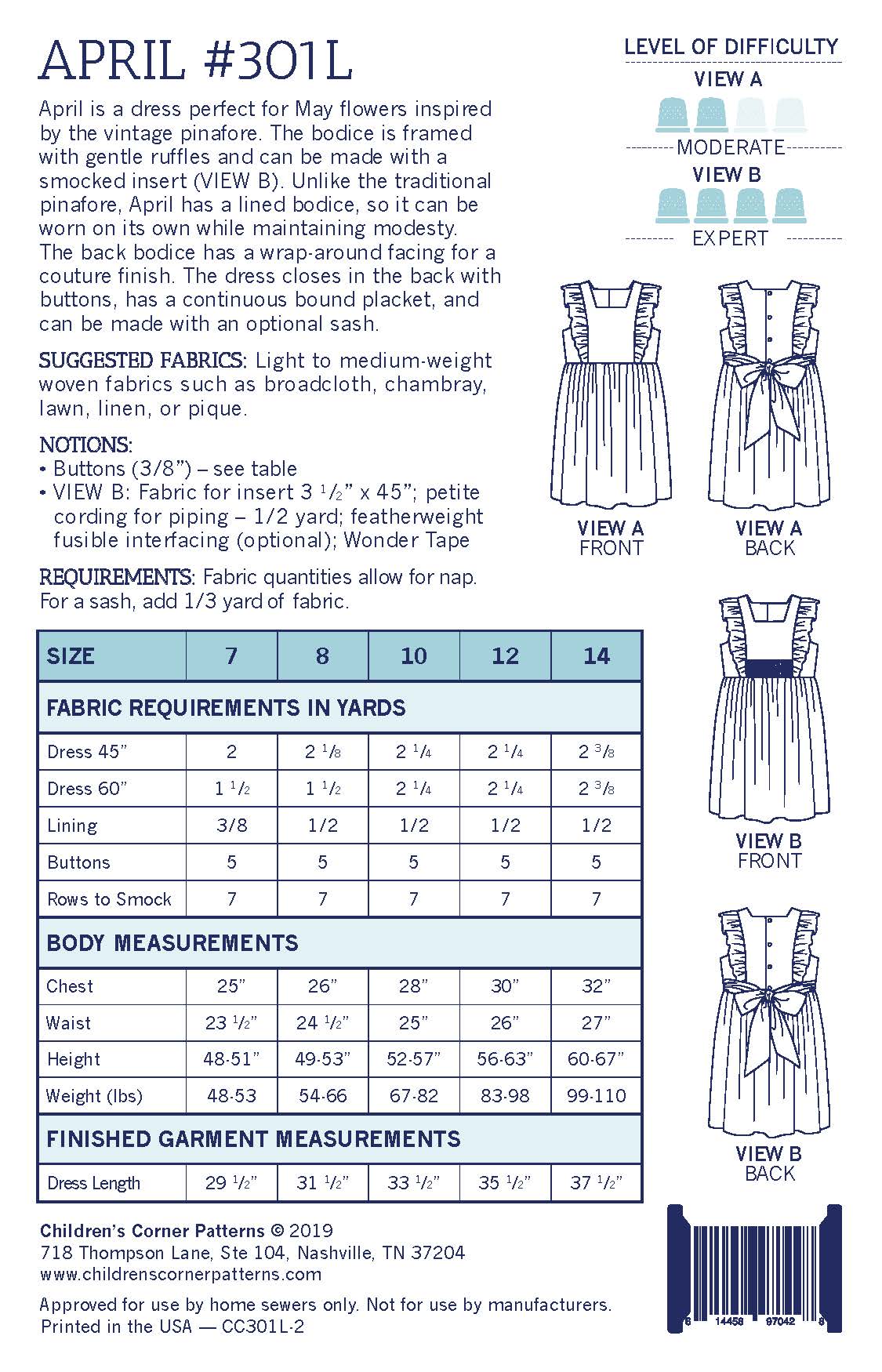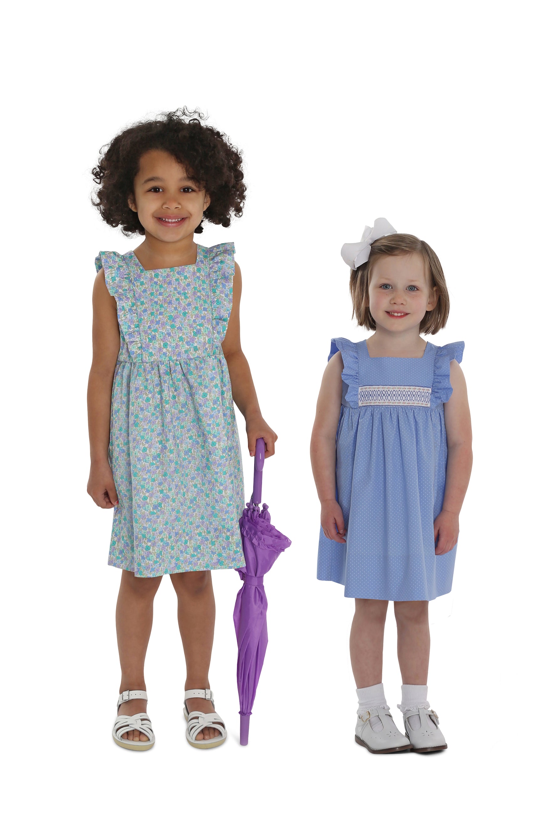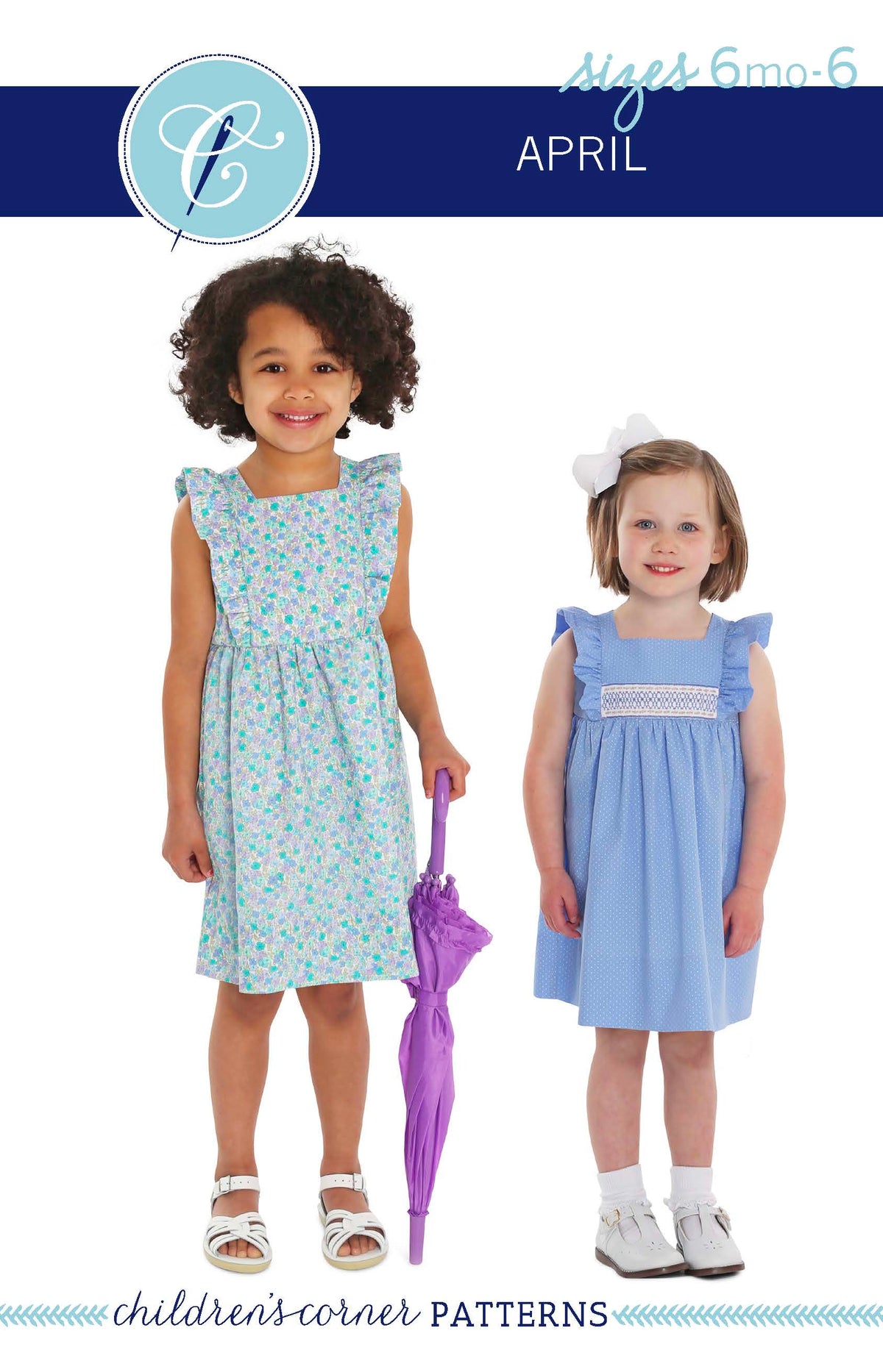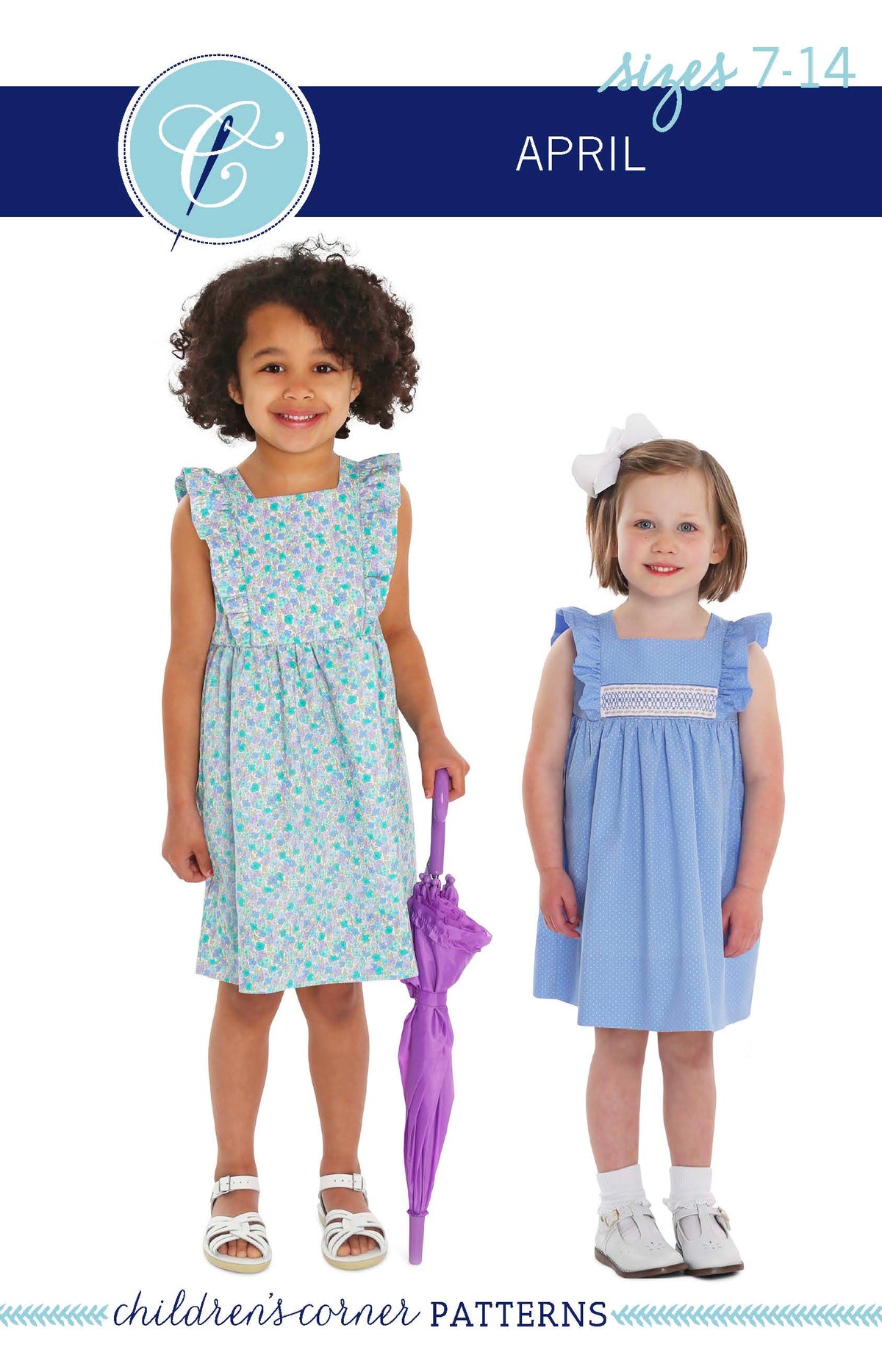 April is a dress perfect for May flowers inspired by the vintage pinafore. The bodice is framed with gentle ruffles and can be made with a smocked insert (View B). Unlike the traditional pinafore, April has a lined bodice, so it can be worn on its own while maintaining modesty. The back bodice has a wrap-around facing for a couture finish. The dress closes in the back with buttons, has a continuous bound placket, and can be made with an optional sash.