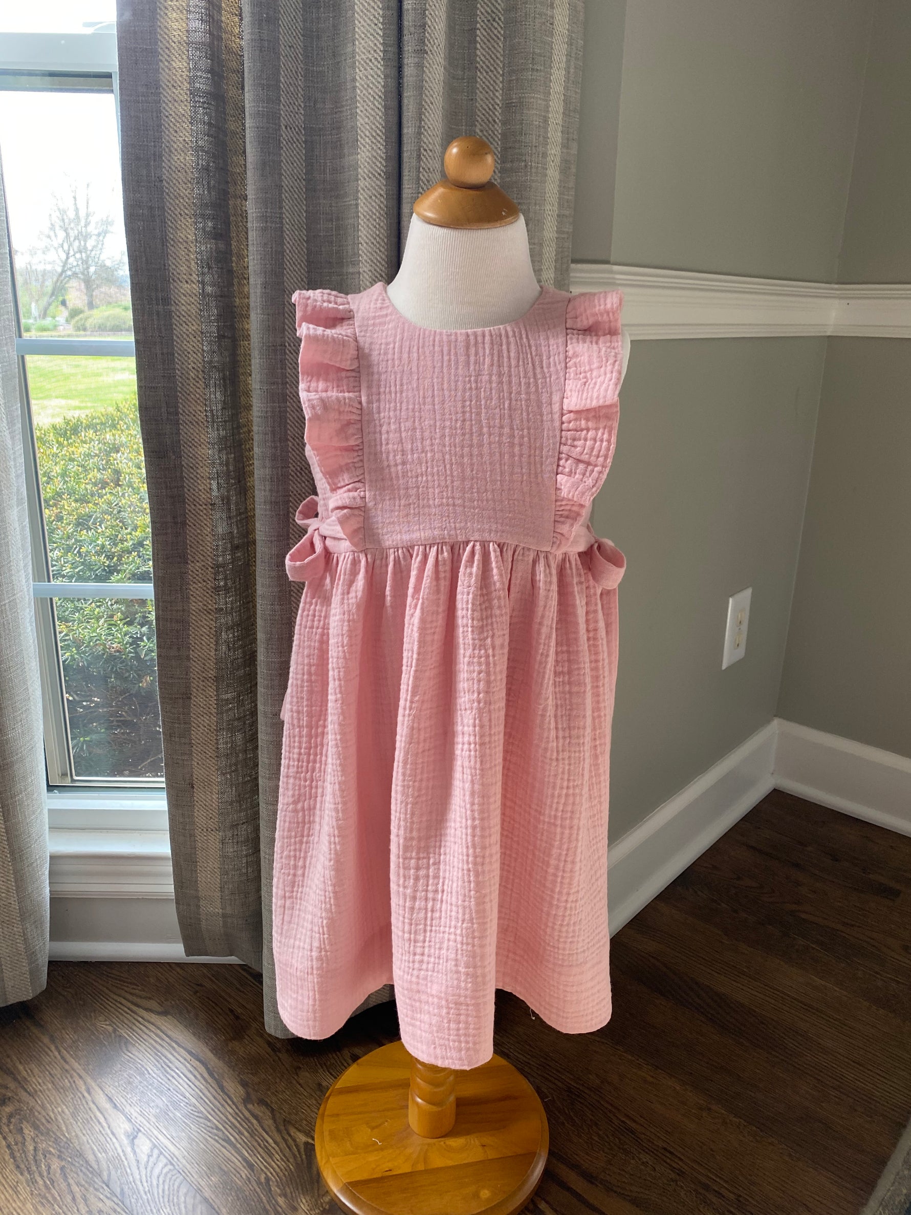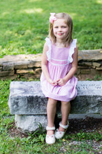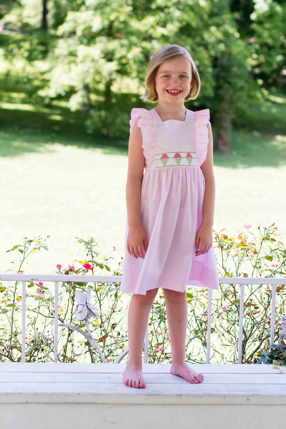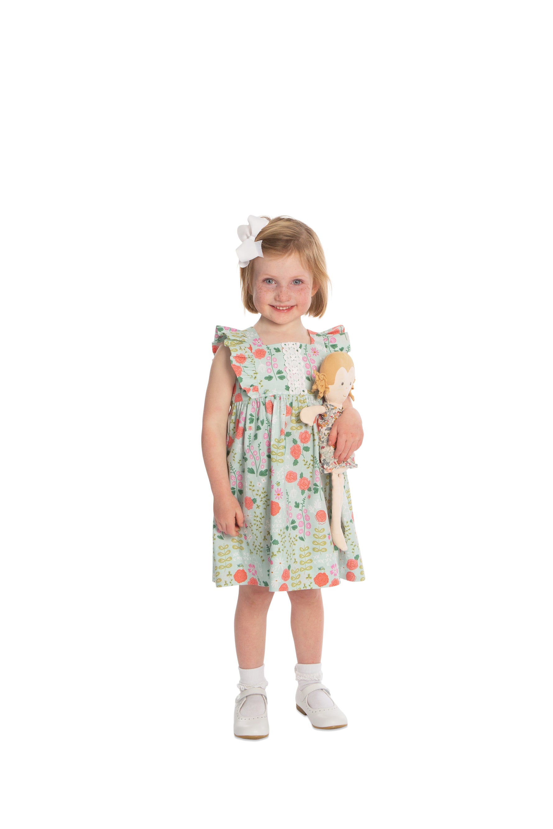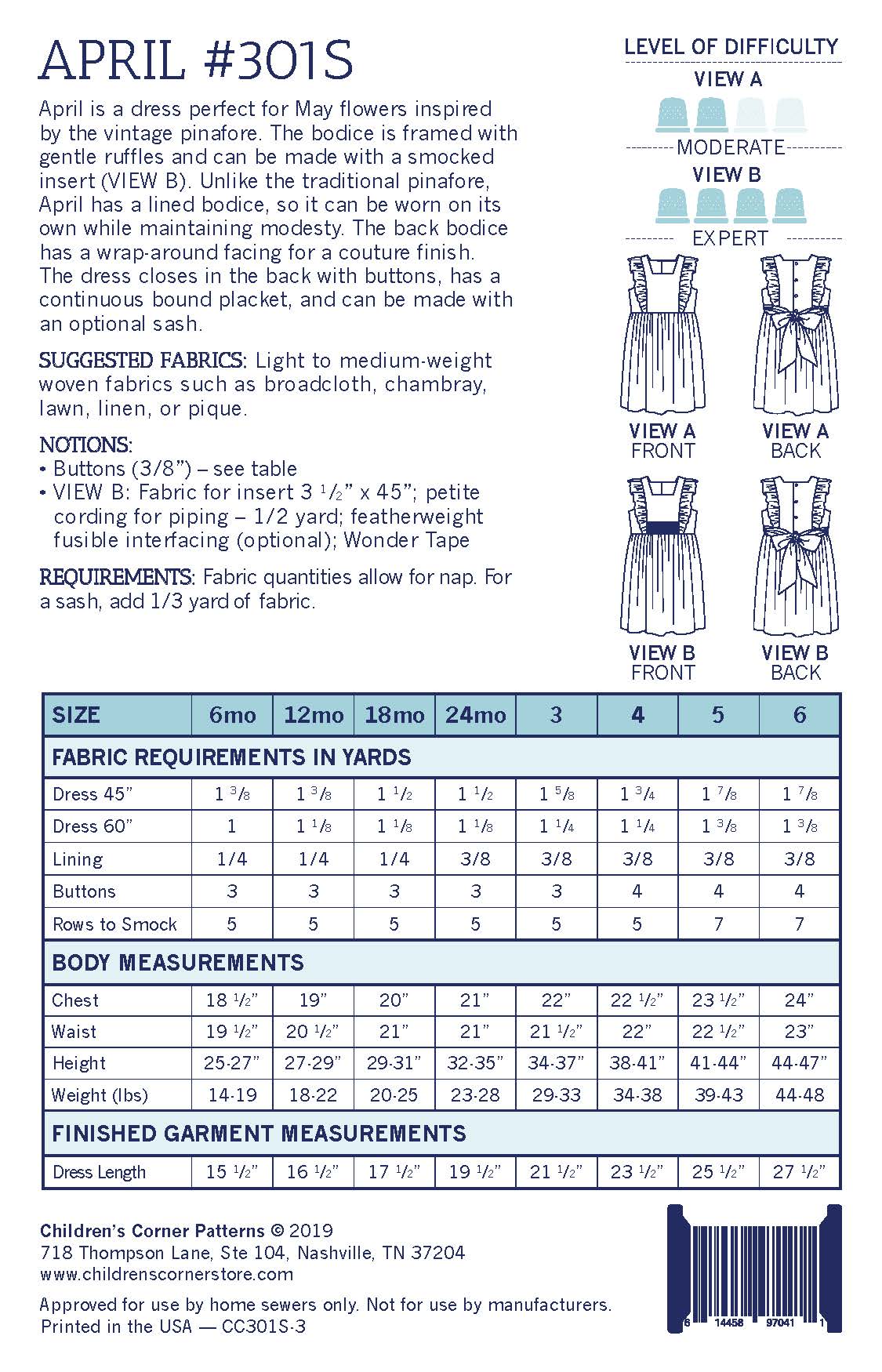 April is a dress perfect for May flowers inspired by the vintage pinafore. The bodice is framed with gentle ruffles and can be made with a smocked insert (View B). Unlike the traditional pinafore, April has a lined bodice, so it can be worn on its own while maintaining modesty. The back bodice has a wrap-around facing for a couture finish. The dress closes in the back with buttons, has a continuous bound placket, and can be made with an optional sash.