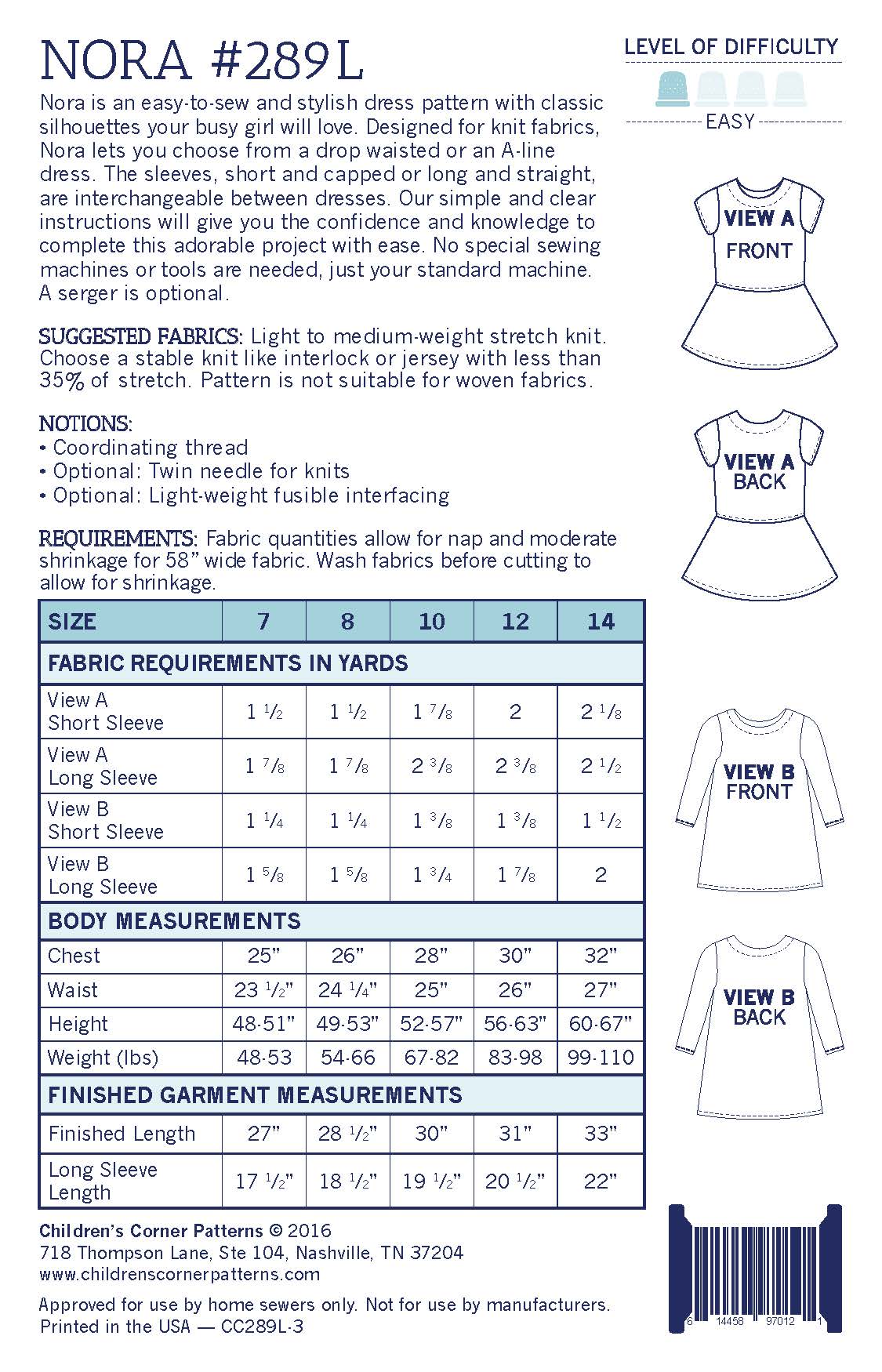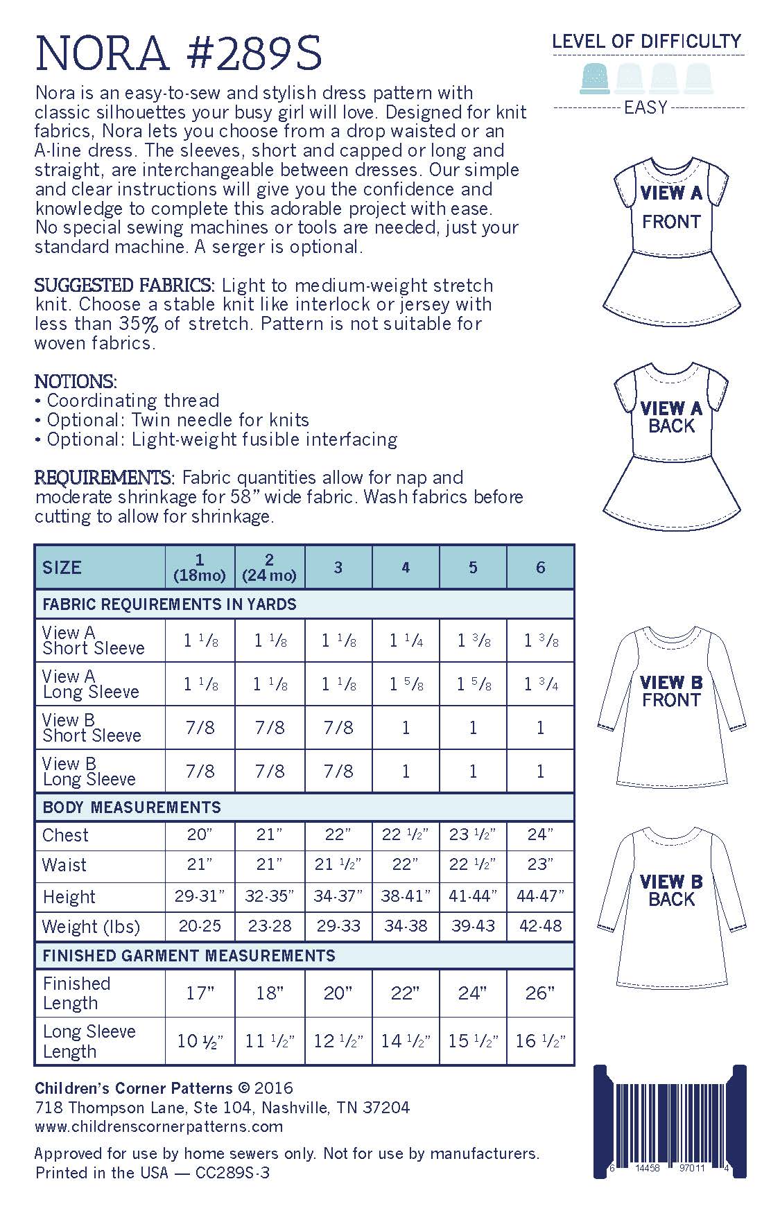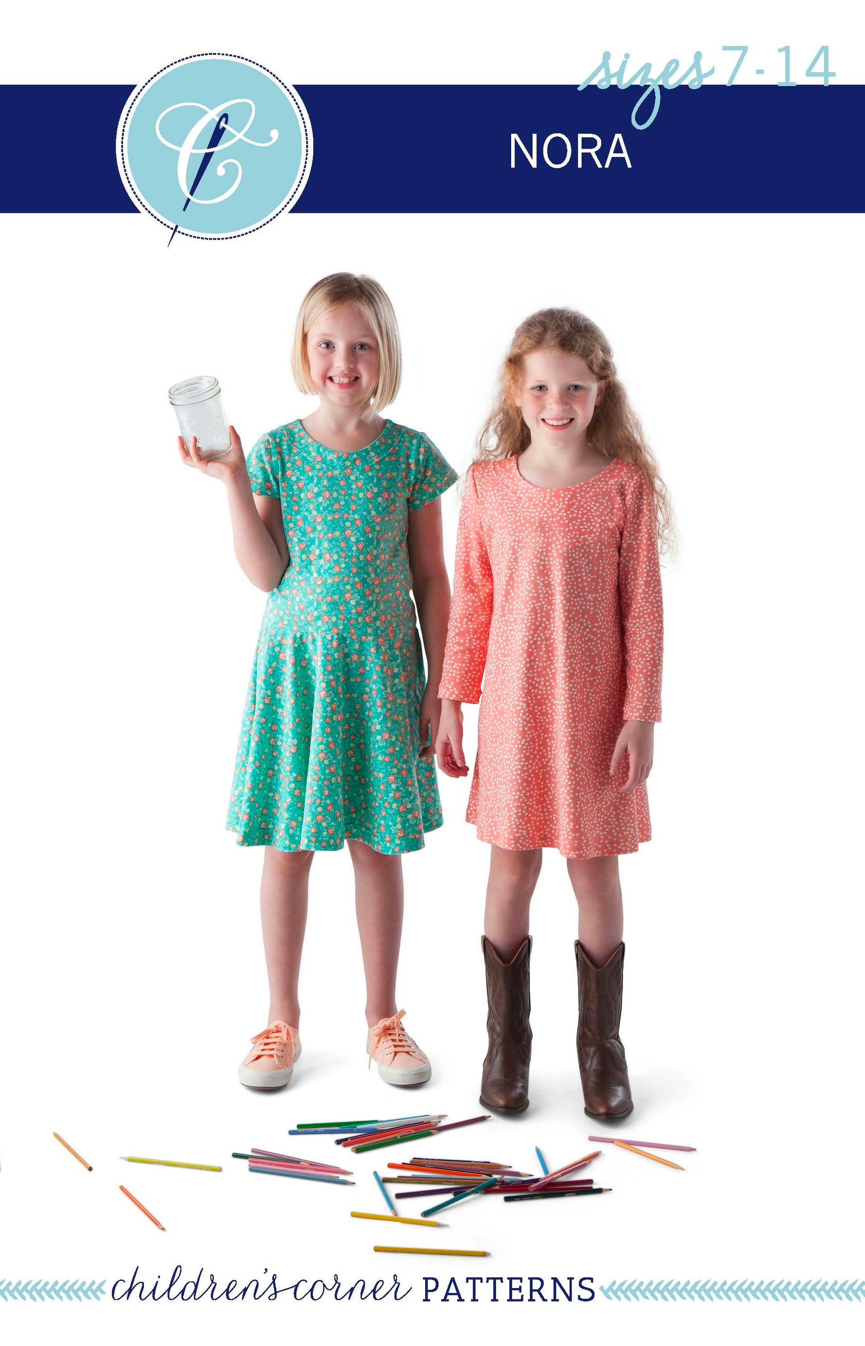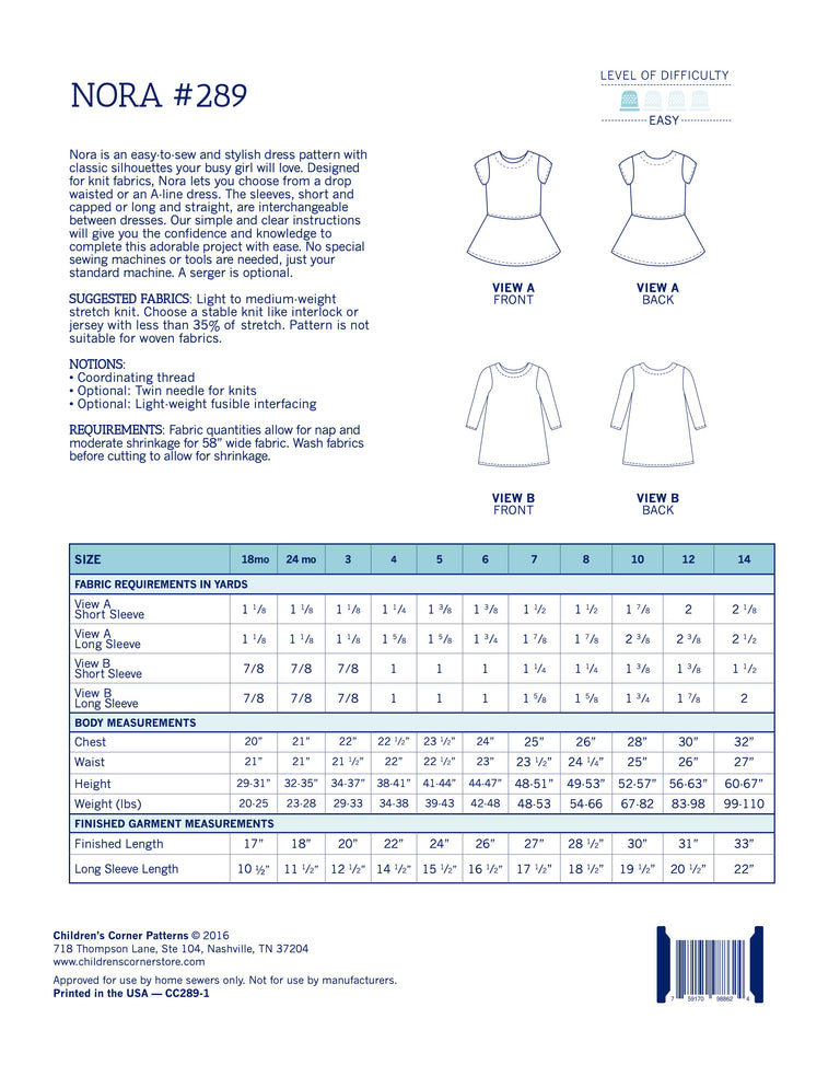 Nora is an easy-to-sew and stylish dress pattern with classic silhouettes your busy girl will love. Designed for knit fabrics, Nora lets you choose from a drop waisted or an A-line dress. The sleeves, short and capped or long and straight, are interchangeable between dresses. Our simple and clear instructions will give you the confidence and knowledge to complete this adorable project with ease. No special sewing machines or tools are needed, just your standard machine. A serger is optional.