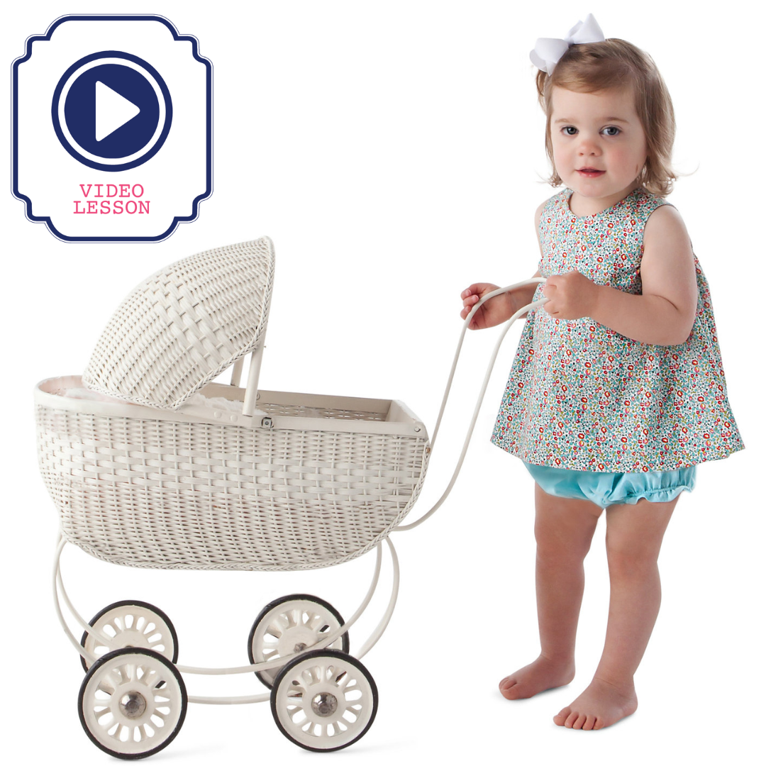 Frannie Baby is a two-piece swing top and bloomer set perfect for everyday play. The fully-lined top has one button in the back and can be made with a Peter Pan collar. The unlined bloomers have elastic at the waist and leg, and the leg opening can be finished with a plain hem or flat eyelet trim. Susan sews this precious set step by step.
