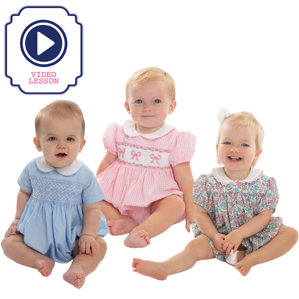 This video lesson will teach you to sew Reese, a classic baby bubble for a boy or girl. The high yoke creates a traditional silhouette with three variations for the body. VIEW A is smocked, VIEW B has a smocked insertion, and VIEW C is gathered. Choose from a banded puff or straight sleeve and finish with piping or gathered trim. The lined yoke buttons down the back with closures at the crotch. An optional sash or belt is included.