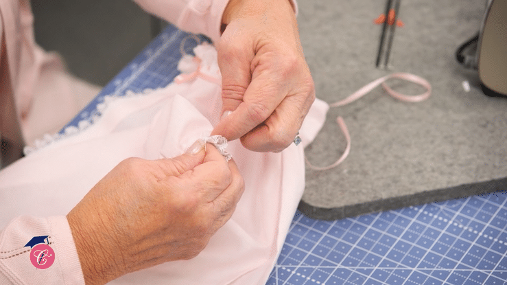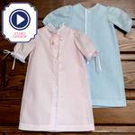 Sutton is a classic daygown for baby. The girl’s view features lace edging around the neck, front facing and sleeves. Ribbon is attached to the beading at the neck and sleeves. The boy’s view features Swiss trim at the front facing with a bias band at the neck and sleeve edge. Also included is a slip that buttons at the shoulder and features a flat lace edging at the hem. A shell edge at the neck and armhole is finished by hand. Susan sews a girl’s and boy’s daygown and a slip.