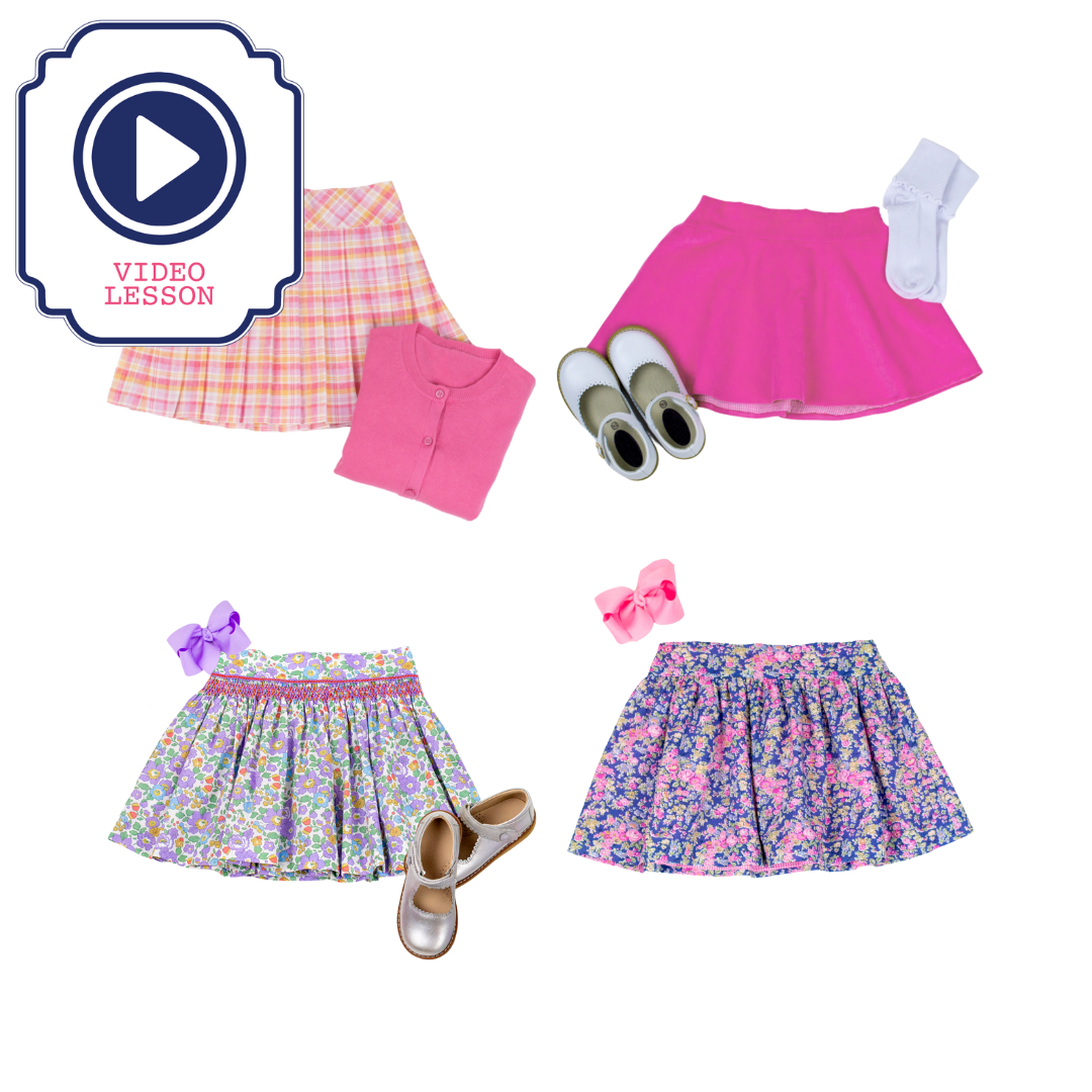 Suzie is a collection of easy-to-sew skirts that she can wear for a playdate, school, casual event, or a special occasion. Included is a circle, gathered, and pleated skirt. The skirts are attached to a lined yoke that is flat in the front and finished with elastic at the back. Instructions are included for an optional lining for the circle or gathered skirt. In addition, the Smocked Skirt is included in the video. With a few rows of smocking placed just below the yoke, the opportunities to customize are abundant. Susan teaches all 4 views from start to finish.