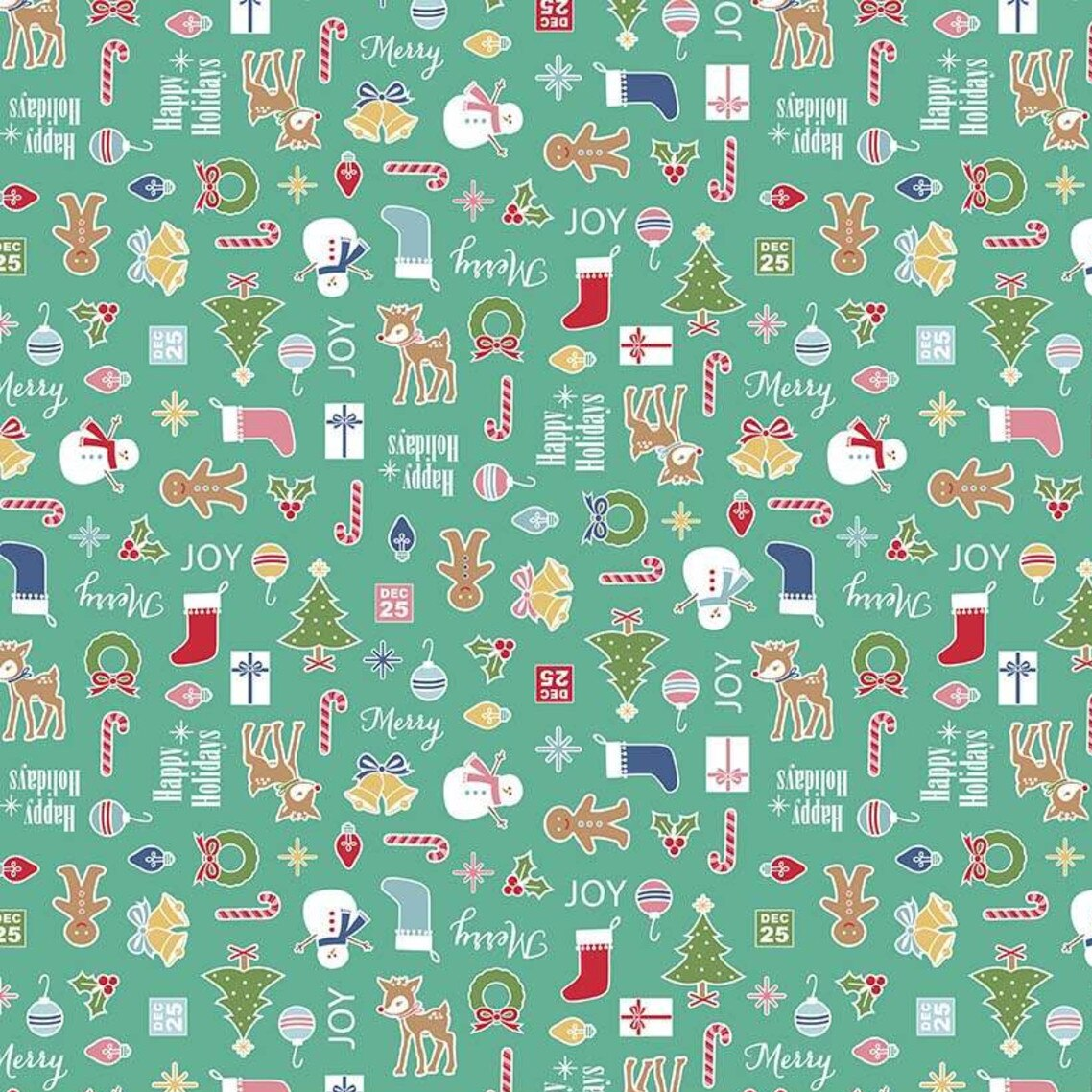 This print features small Christmas icons such as stockings, wreaths, Christmas trees, candy canes, reindeer, gingerbread men, and more.