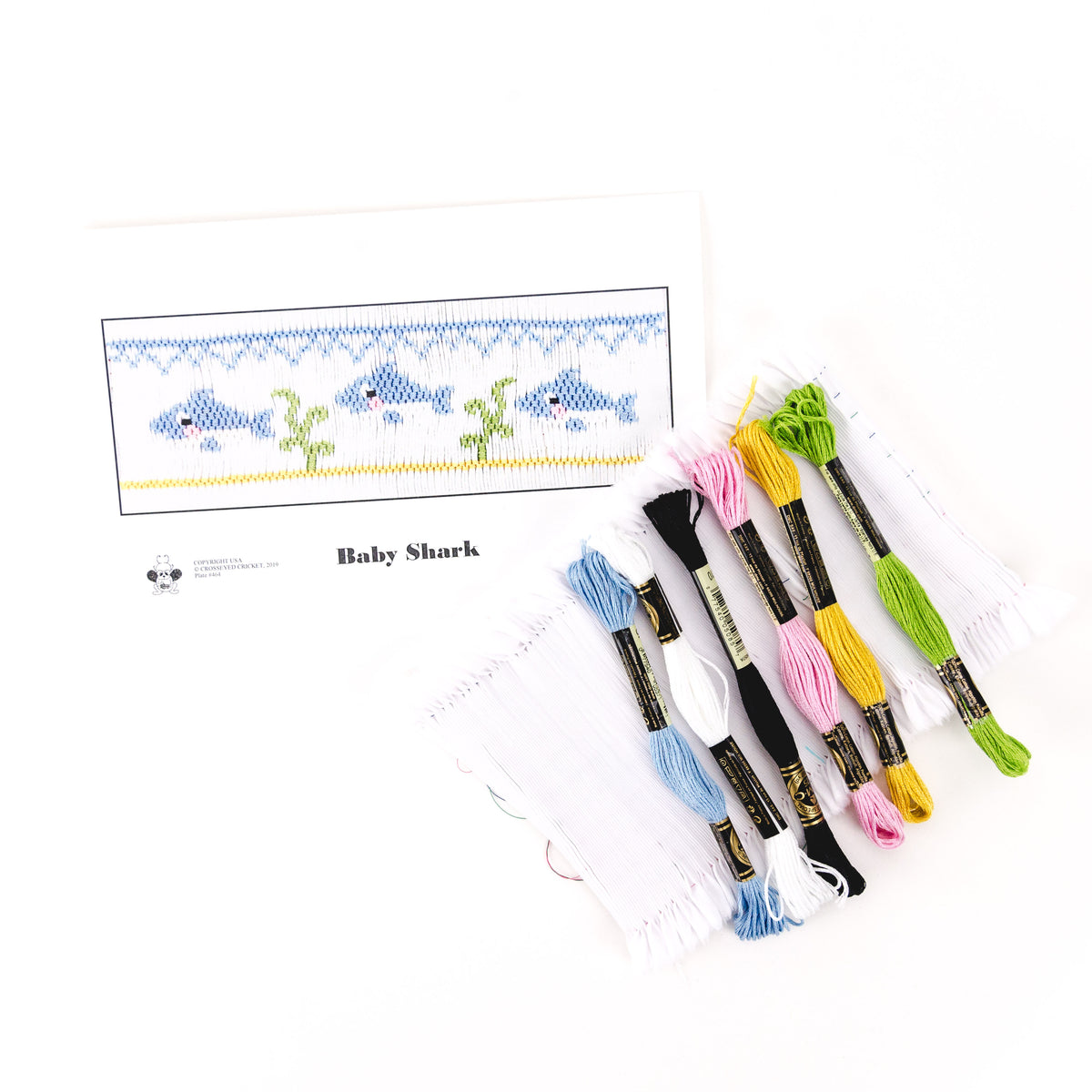 Pleated insert kits include a pleated insert, smocking plate, and DMC embroidery floss expertly chosen for this design.