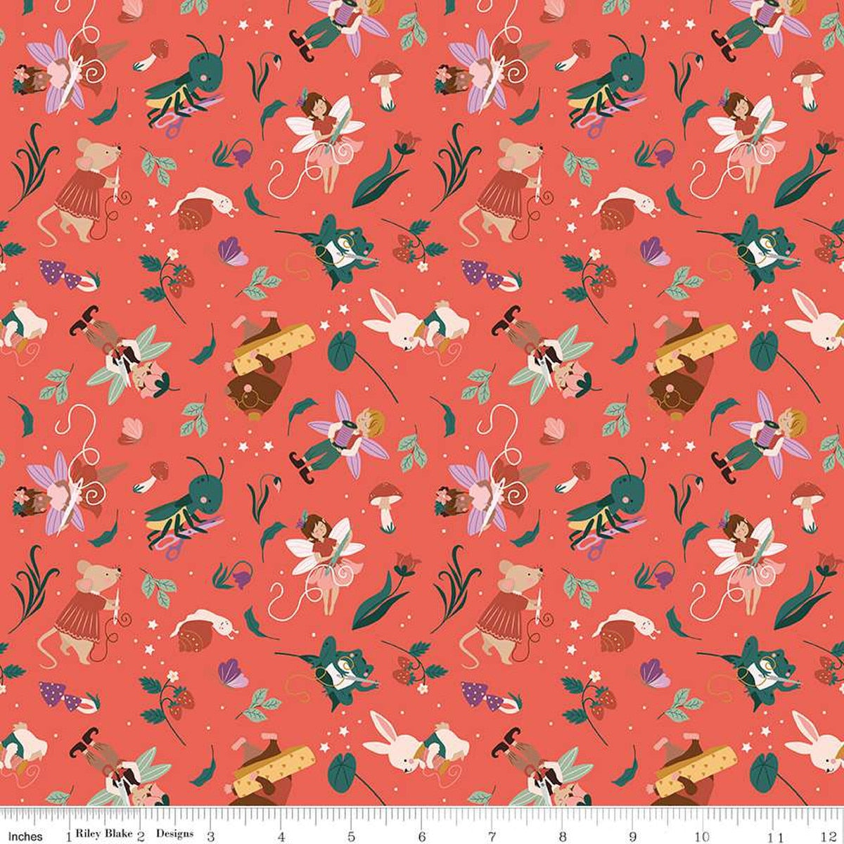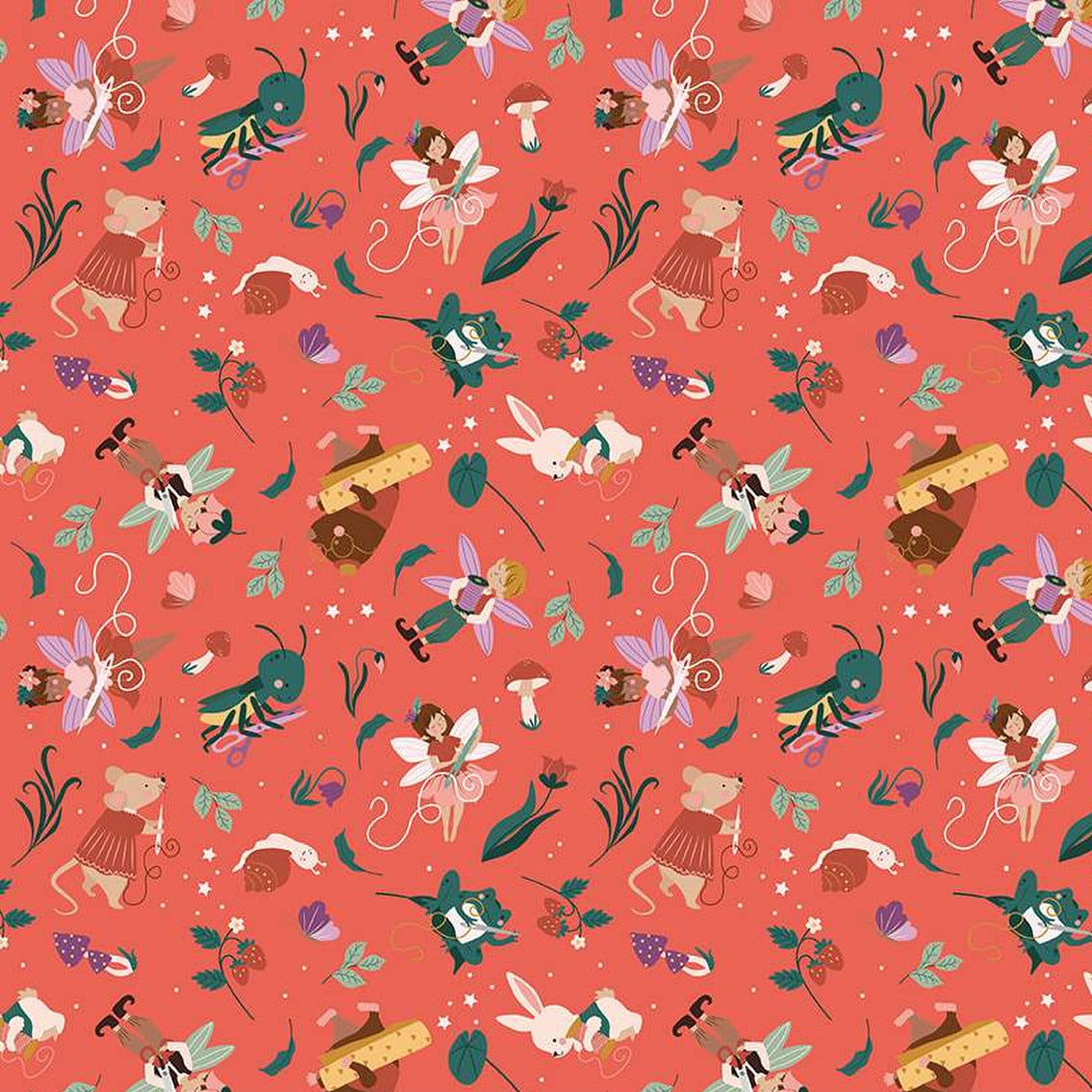 This print features fairies, snails, mice, frogs, grasshoppers, mushrooms, flowers, stars, and more.
