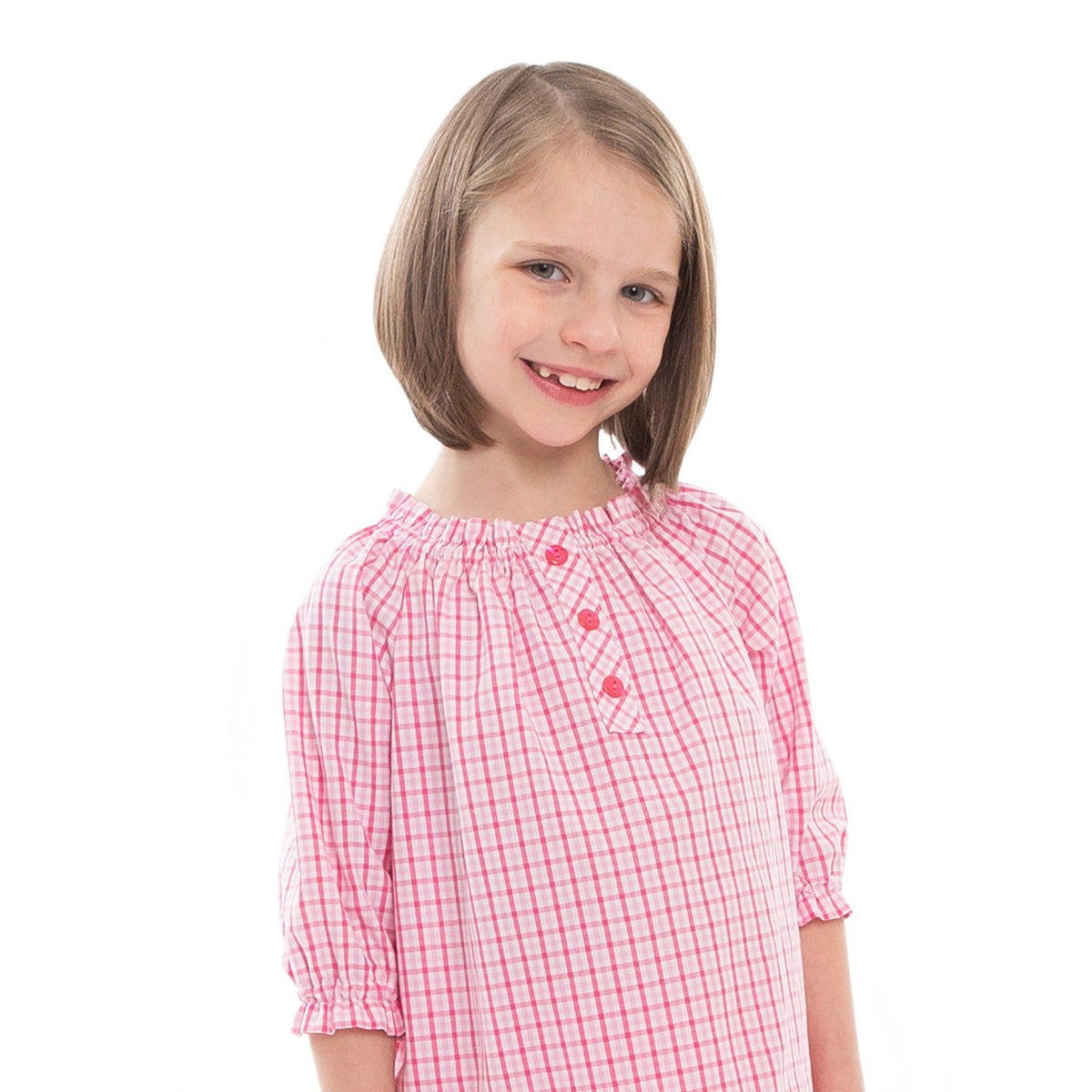 Pictured is Ella blouse with faux placket with Hot Pink Shiny Buttons.