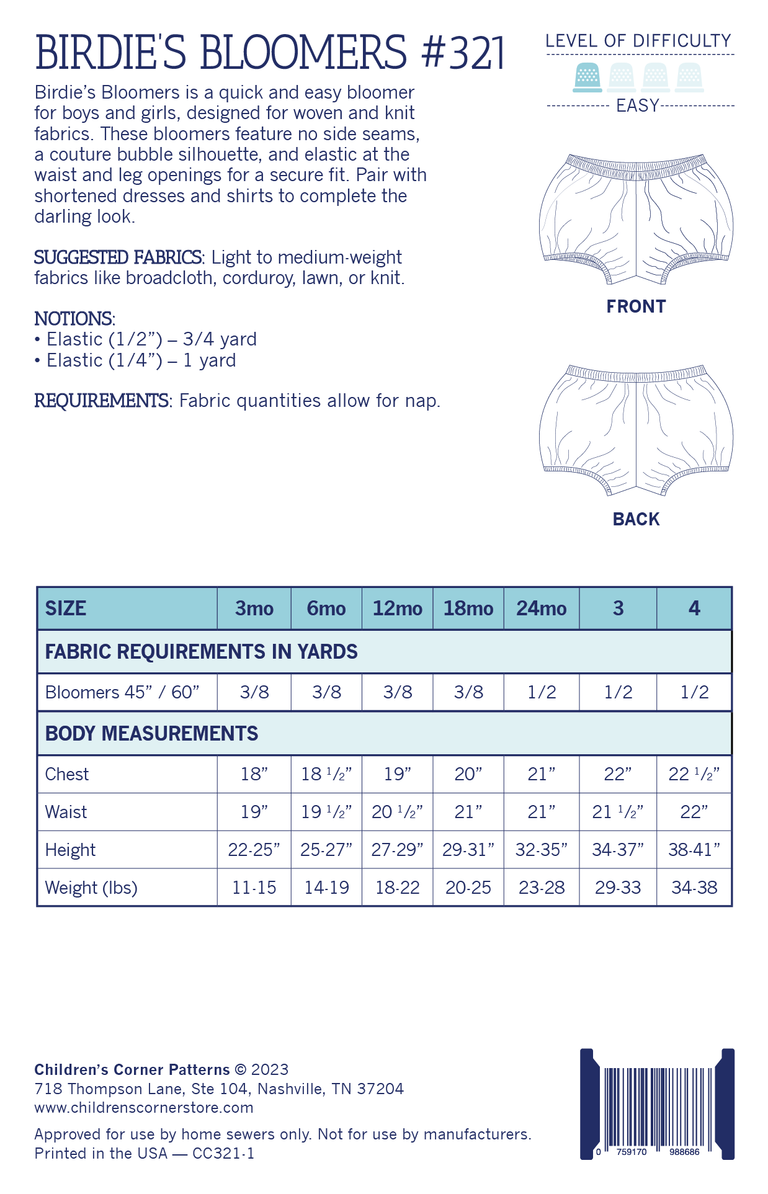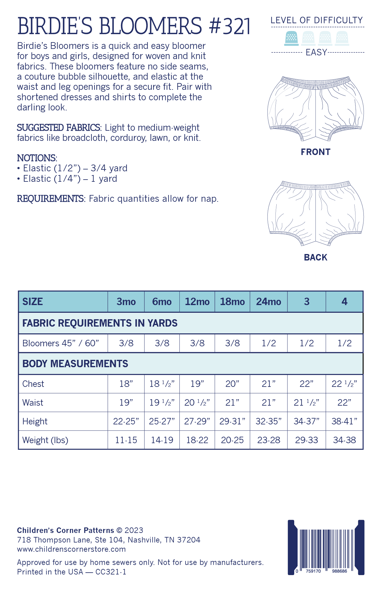 Birdie’s Bloomers is a quick and easy bloomer for boys and girls, designed for woven and knit fabrics. These bloomers feature no side seams, a couture bubble silhouette, and elastic at the waist and leg openings for a secure fit. Pair with shortened dresses and shirts to complete the darling look.
