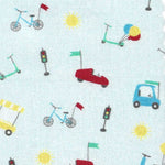 Cars, Bicycles, Scooters, and Traffic Lights Fabric – Print #2789. 100% cotton print. 60″ wide. This fabric has cars, bicycles, scooters, and traffic lights on a light blue background — ideal for dresses, skirts, or other outfits.