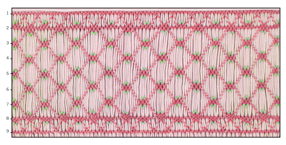 Smocking plate with a geometric design a yoke. 9 rows of smocking on a yoke.
