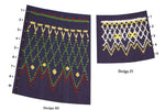 Smocking plate with a geometric design with four variations including one for Christmas with holly and bows. 6-8 rows of smocking on a bishop.