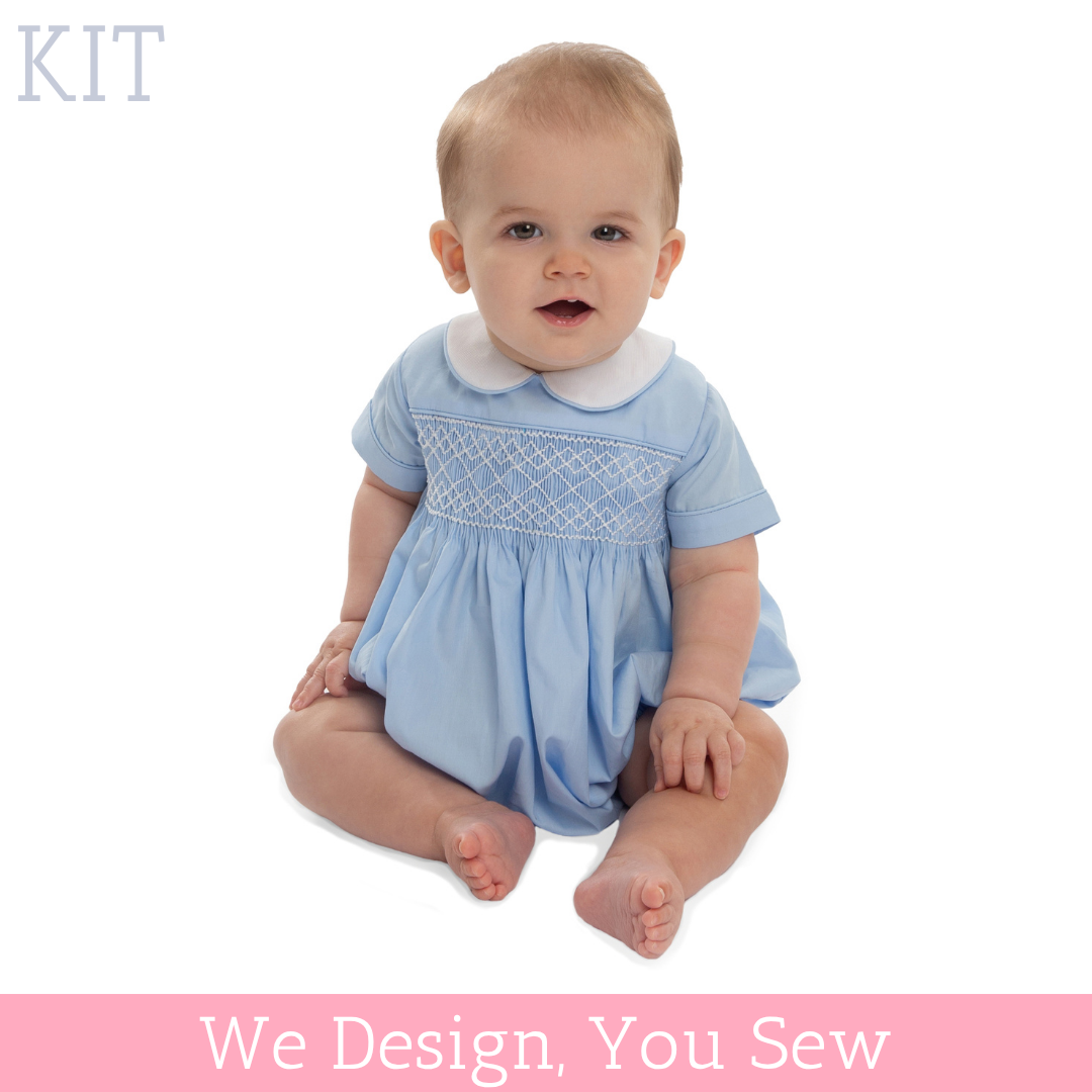 Let us help you create this classic bubble! We will pleat across the full width of one side of the fabric for you to smock and finish construction on this adorable outfit. Kits include fabric and necessary notions as listed below. This kit contains items enough for the girl or boy sleeve and the sash or belt options.