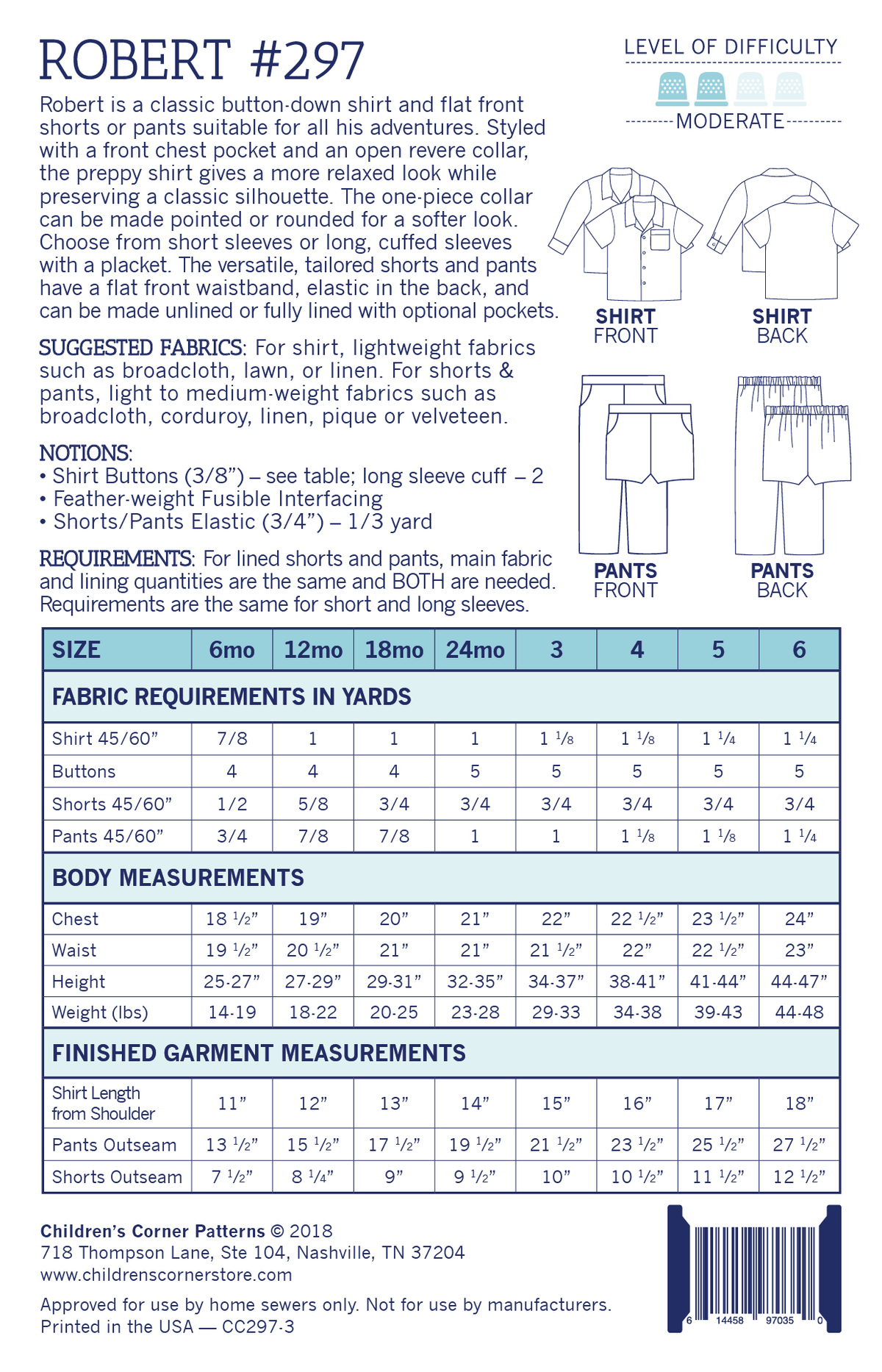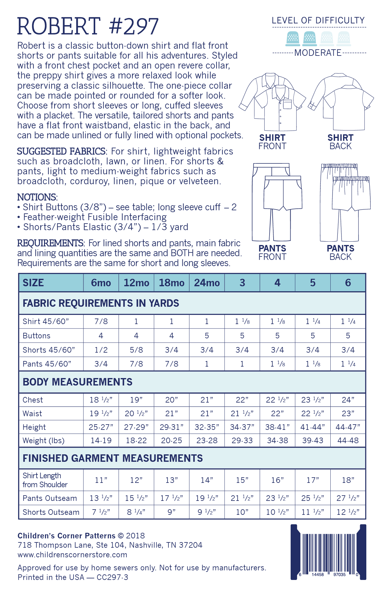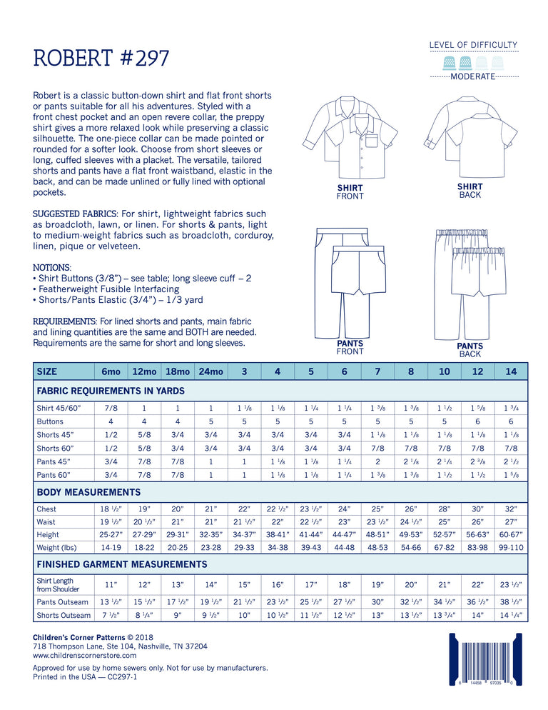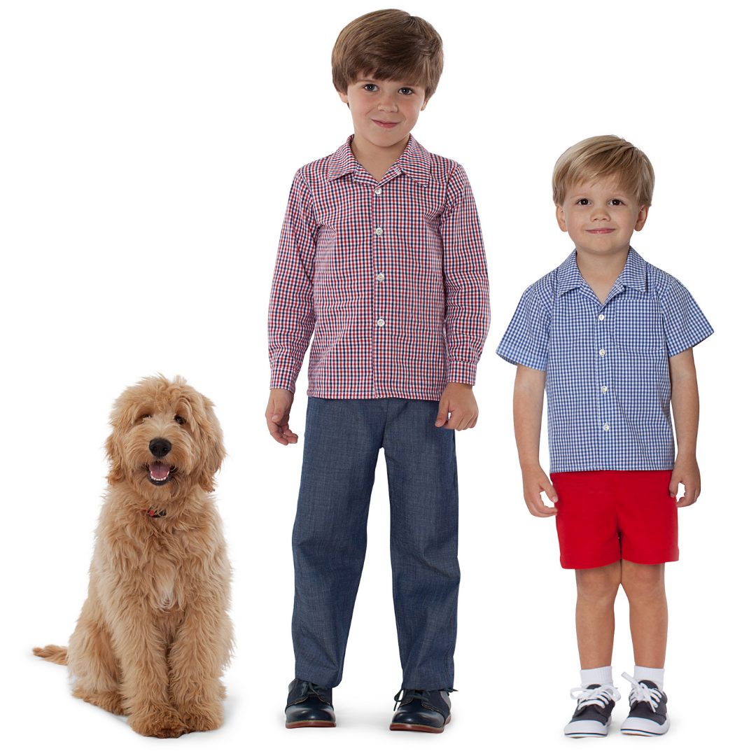 Robert is a classic button-down shirt and flat front shorts or pants suitable for all his adventures. Styled with a front chest pocket and an open revere collar, the preppy shirt gives a more relaxed look while preserving a classic silhouette. The one-piece collar can be made pointed or rounded for a softer look. Choose from short sleeves or long, cuffed sleeves with a placket. The versatile, tailored shorts and pants have a flat front waistband, elastic in the back, and can be made unlined or fully lined with optional pockets. Sizes 7-14 are available in PDF digital download only.