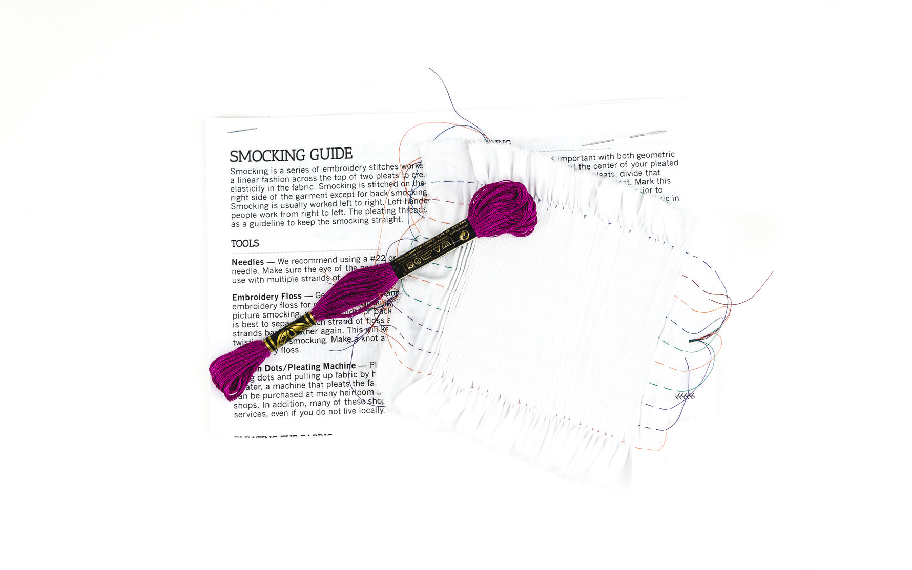 The Children's Corner Smock-a-Stitch Starter Kit includes a sample size pleated insert, a smocking needle, one skein of DMC embroidery thread, and basic instructions to practice and refine your smocking skills.